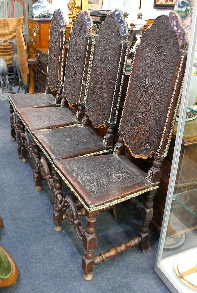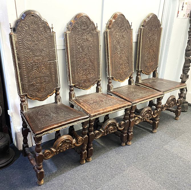 A set of four 18th / 19th century Spanish / Portuguese studded leather and fruitwood high back chairs, typically decorated with ornate embossed work, carved and turned frames with brass finials, (af).
