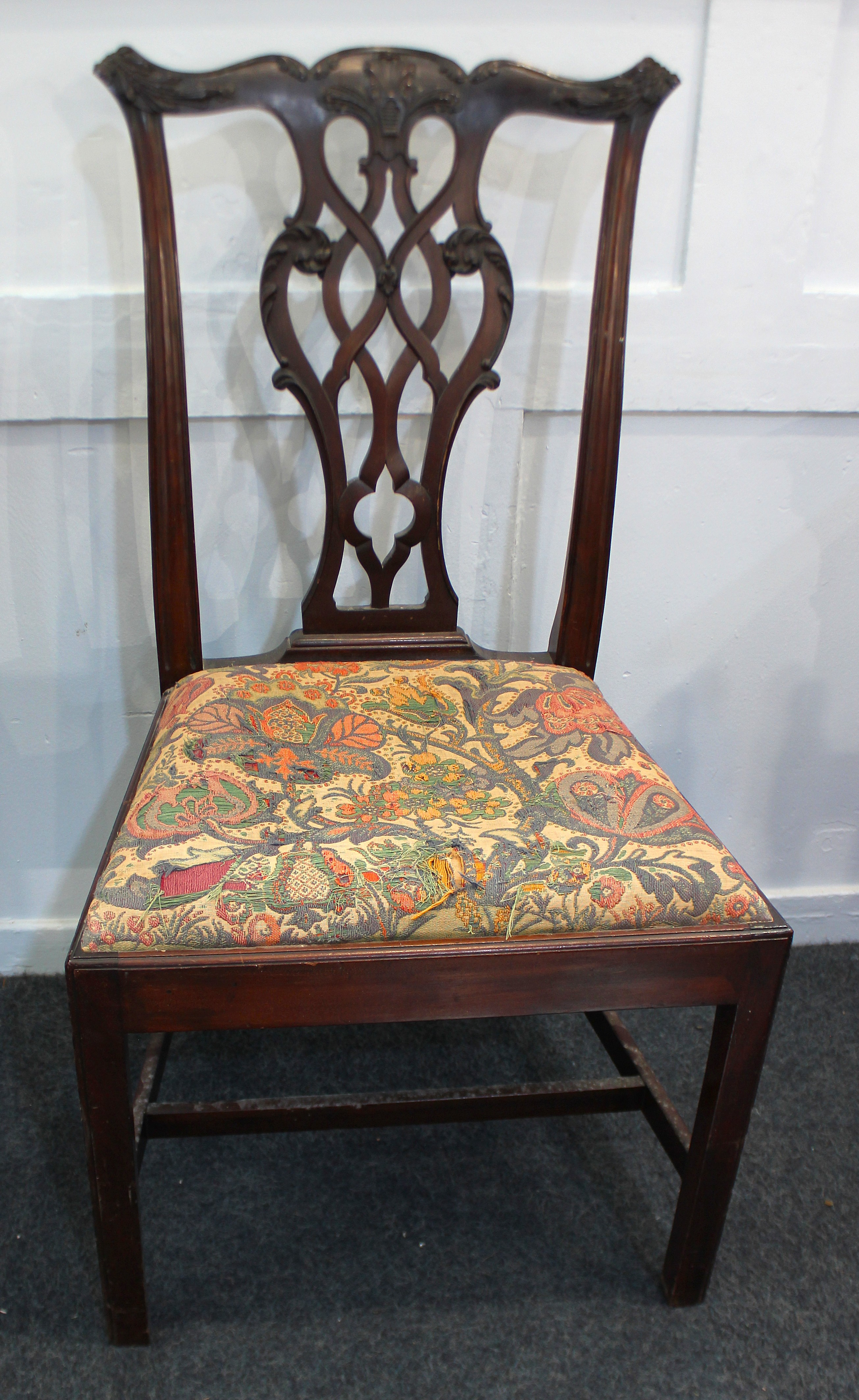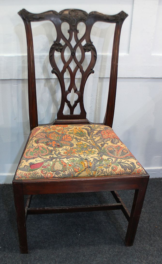 A 19th century Chippendale design carved mahogany single chair, with Edwards & Roberts label underside, (the tapestry upholstered drop in seat af).