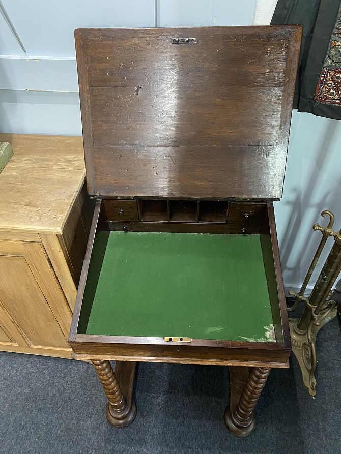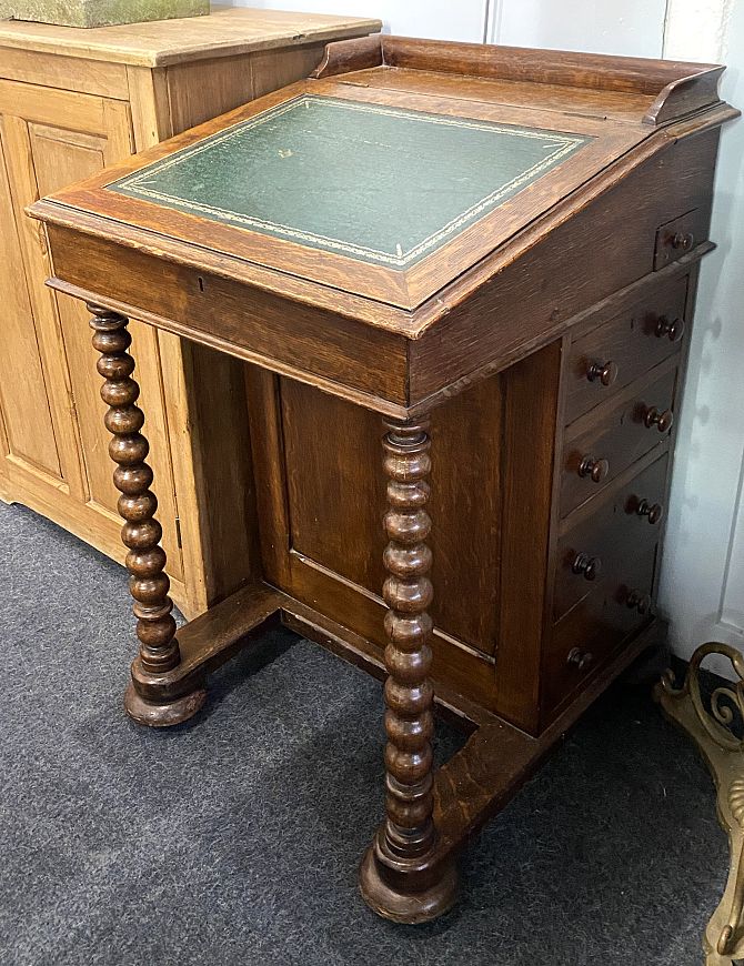 A Victorian oak Davenport desk leather inlaid writing slope with four drawers and four opposing dummy drawers, barley twist columns on platform base to bun feet and castors height 86cm, width 56cm, depth 58cm