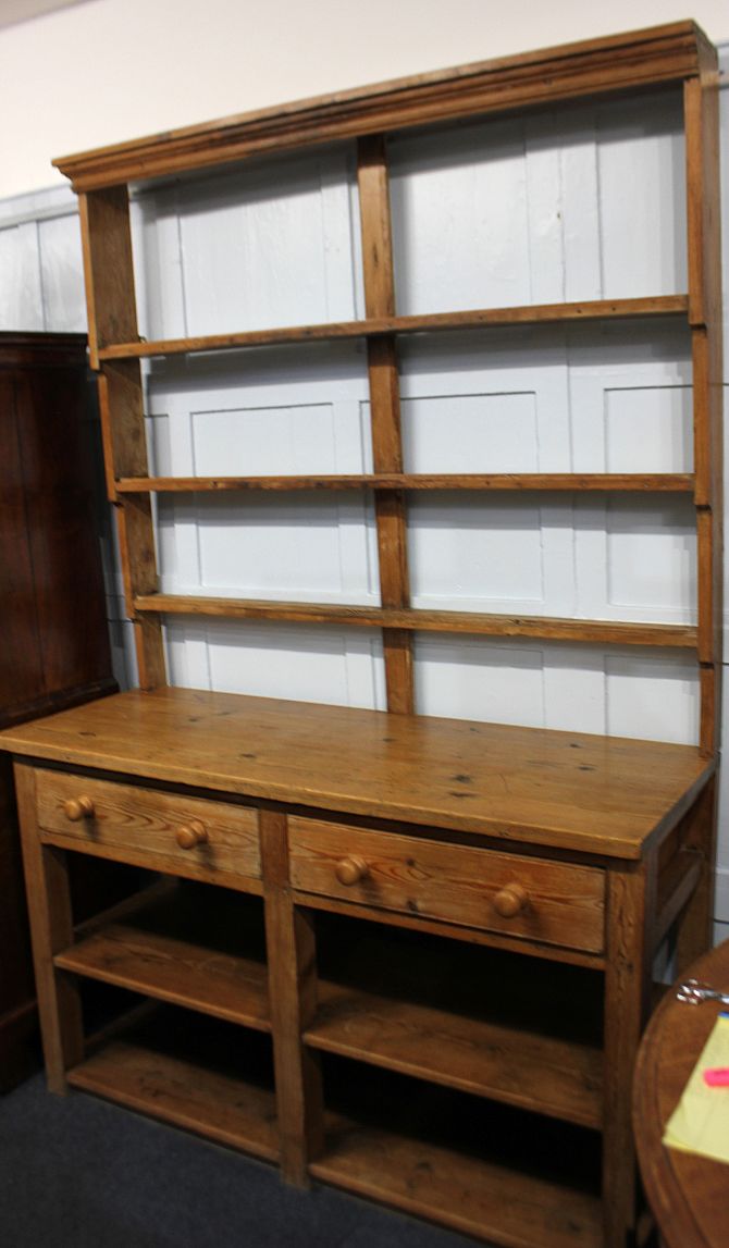 A rustic pine dresser, late 19th / early 20th century, having a shaped canopy above three open shelves, the base section fitted with two drawers above two open tiers, raised on solid supports, 153cm wide by 54cm deep by 225cm high (top is removable).