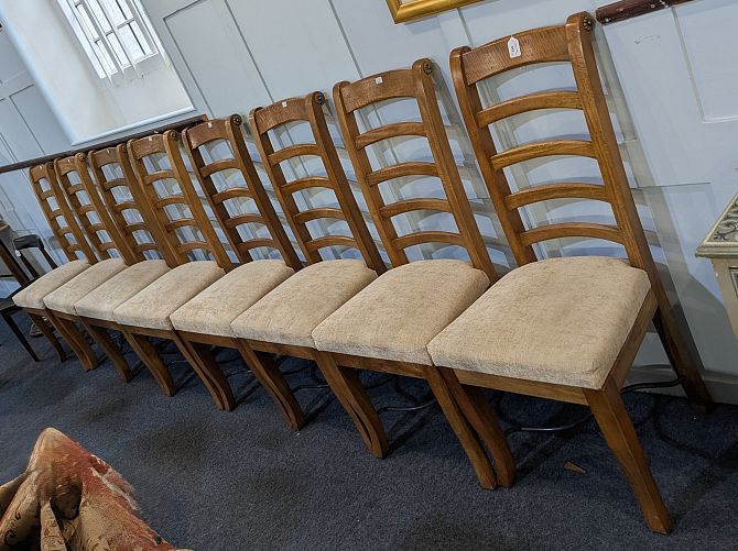 A set of eight 20th century solid fruitwood ladder back dining chairs with metal mounts and neutral upholstered seats