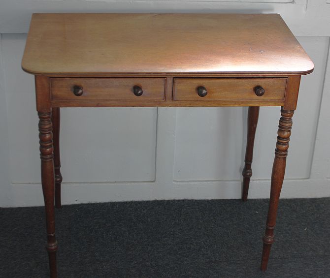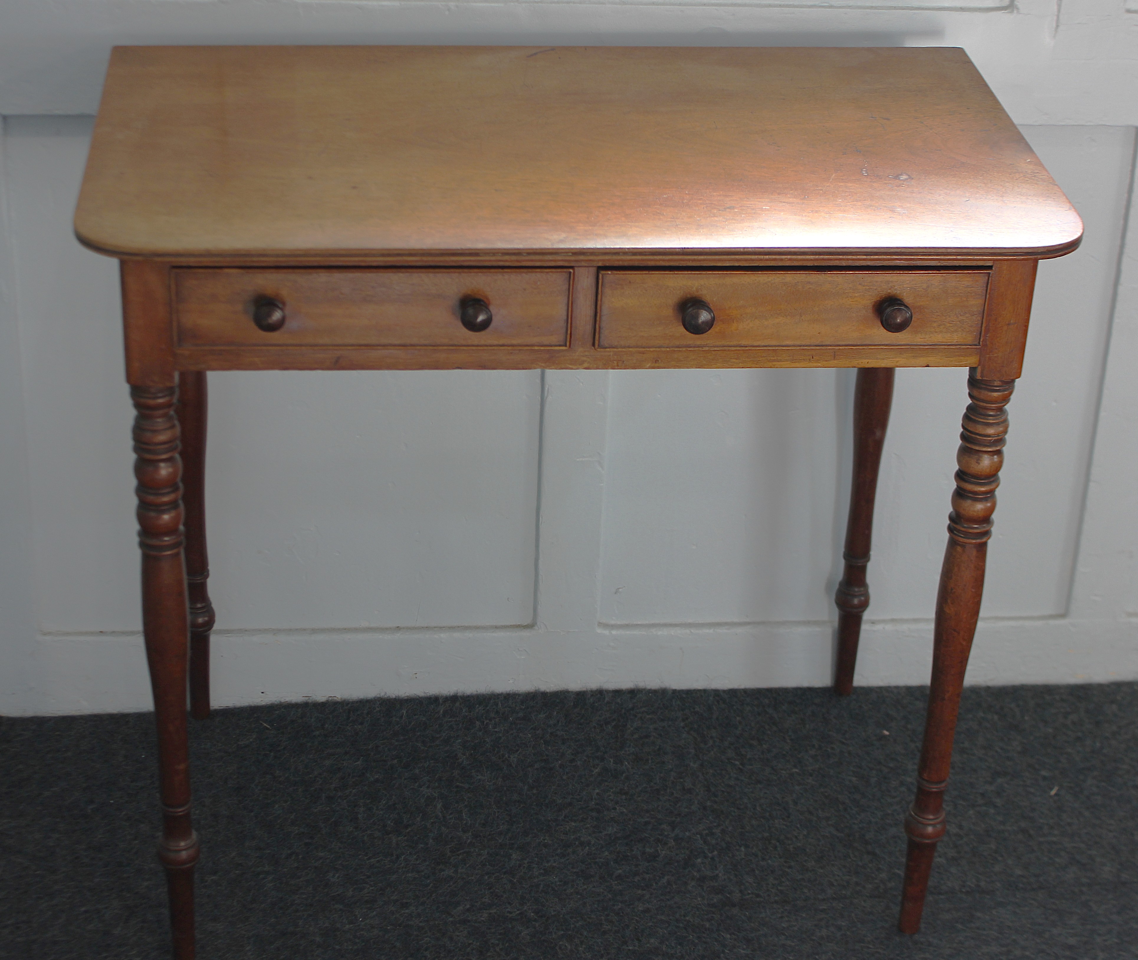 A 19th century two drawer side table, raised on turned cylindrical supports, 84cm wide by 40cm deep by 78cm high.