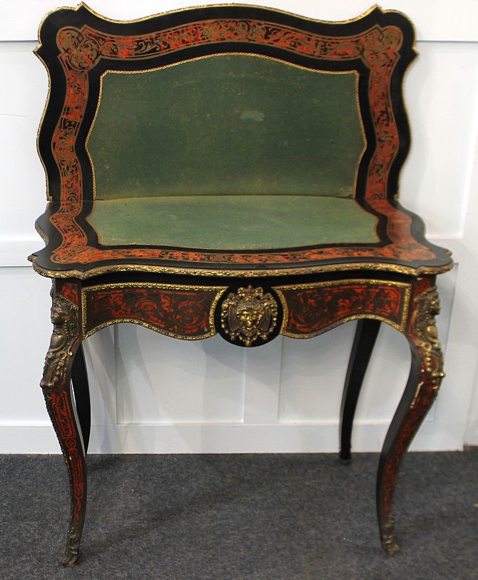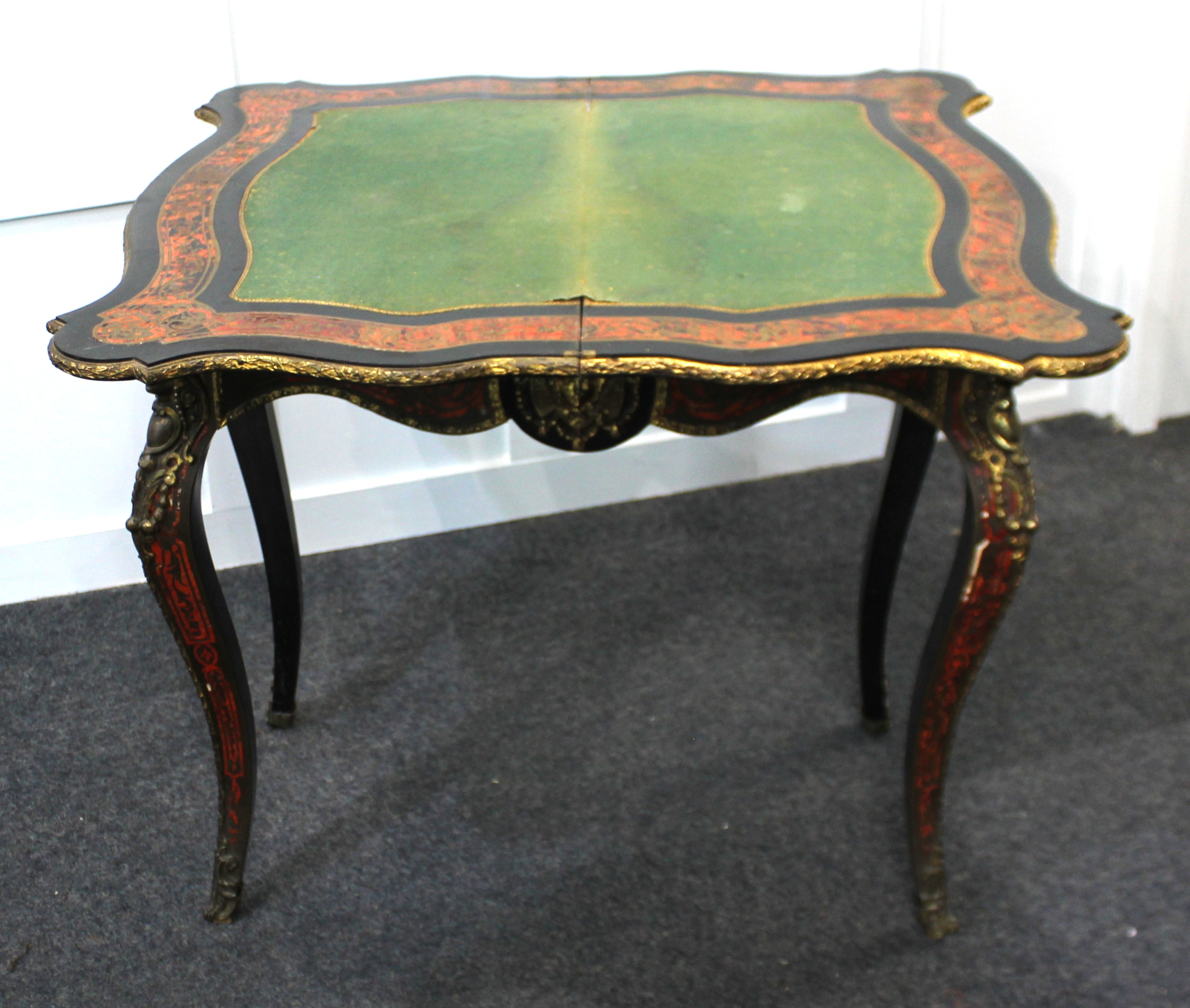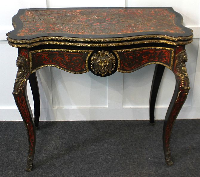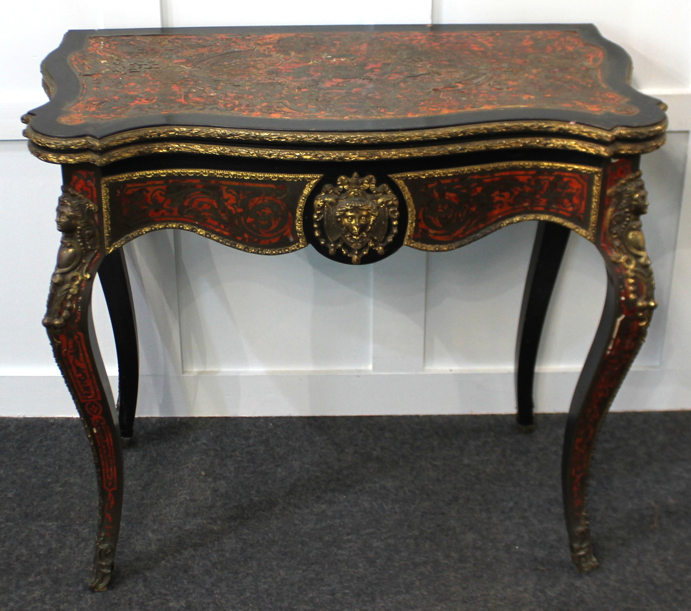 A 19th century ormolu mounted ebonised Boulle card table, the brass inlaid tortoiseshell panels in need of some attention, the hinded and swivel serpentine d top enclosing a green baize lined interior, raised on ogee supports, 88cm wide, (af).