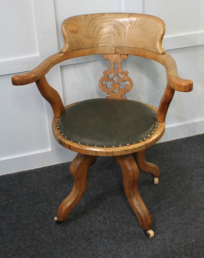 An Edwardian light oak swivel office chair, with leatherette seat, raised on ceramic casters.