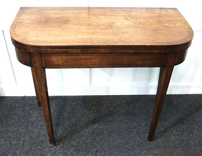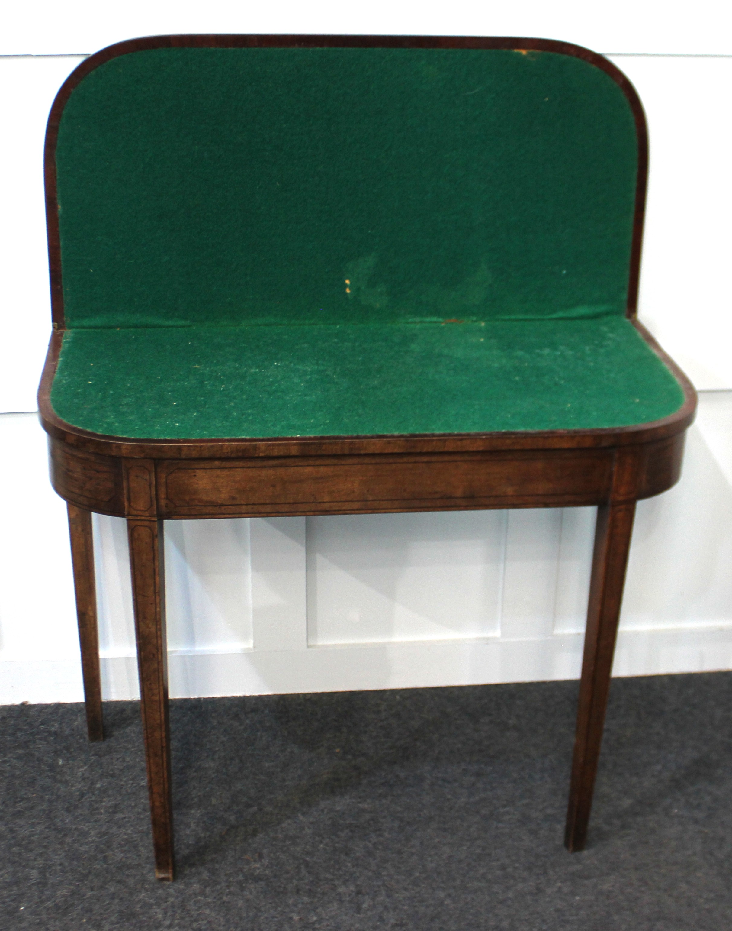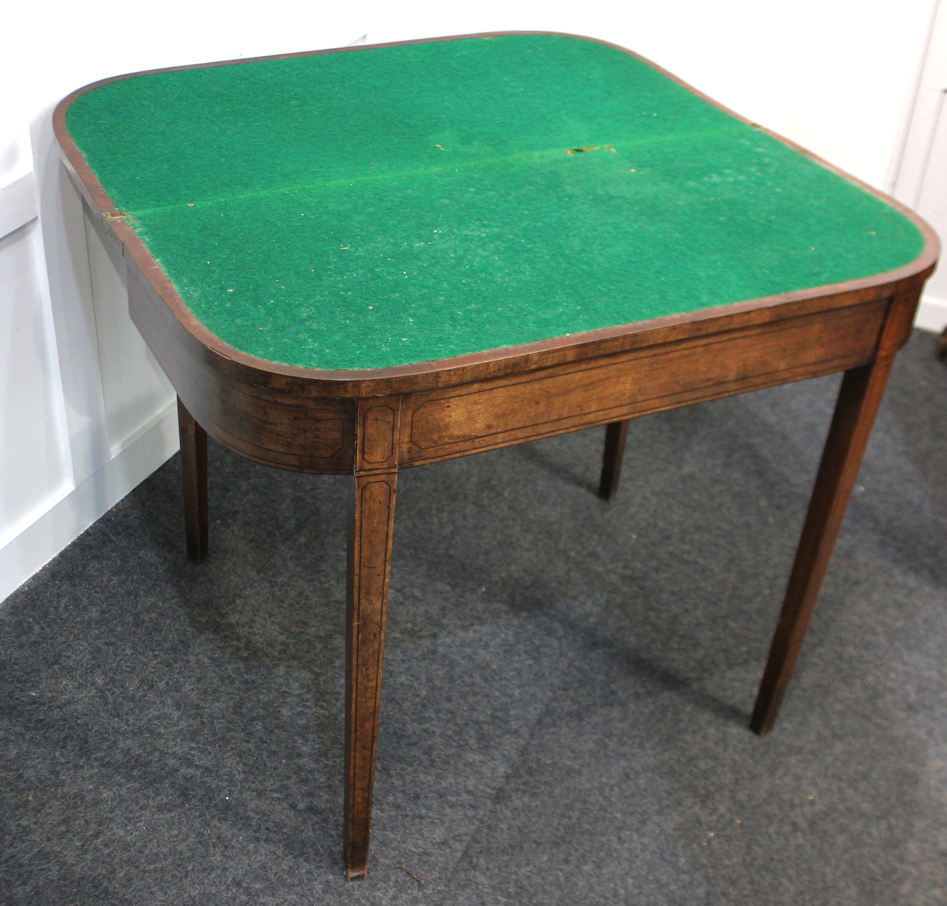 A George III mahogany card table inlaid with ebony stringing, c.1800, the higed top with rear gate leg supports enclosing a green baize lined interior, raised on tapered supports, 91cm wide.