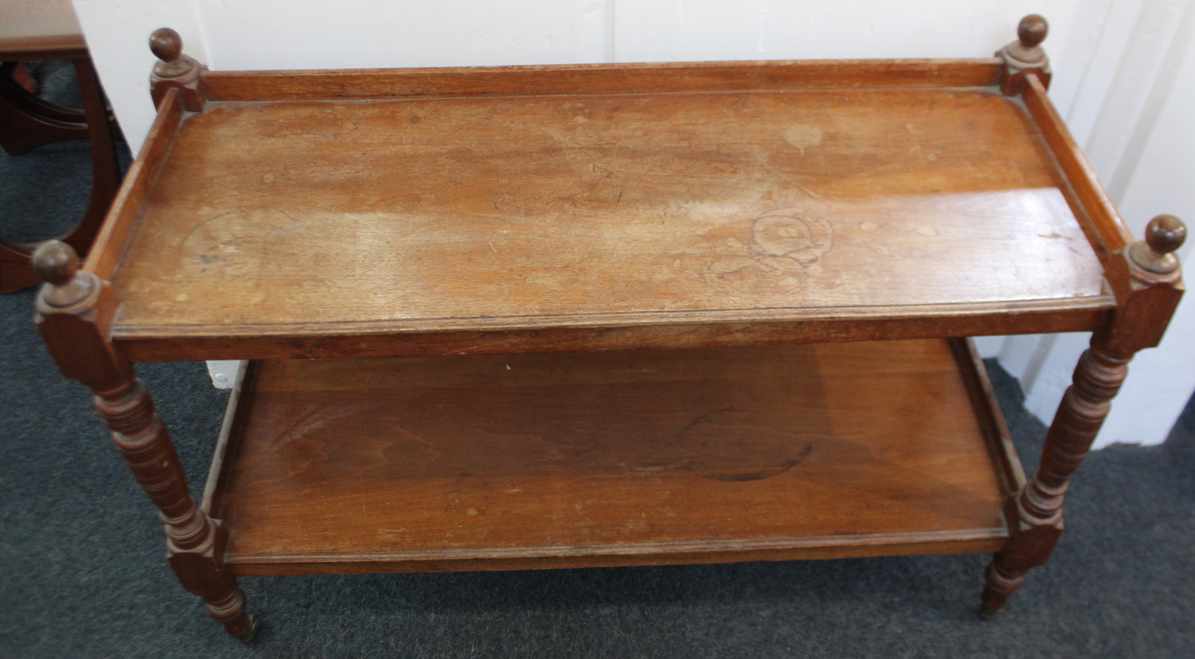 A 19th century mahogany two tier low buffet / serving table, with three quarter gallery, turned knob finials, vase turned and block uprights, and raised on original brass casters, 104cm wide by 43cm deep by 69cm high.