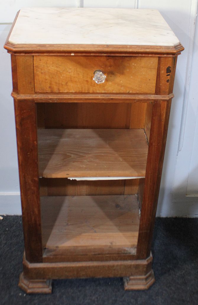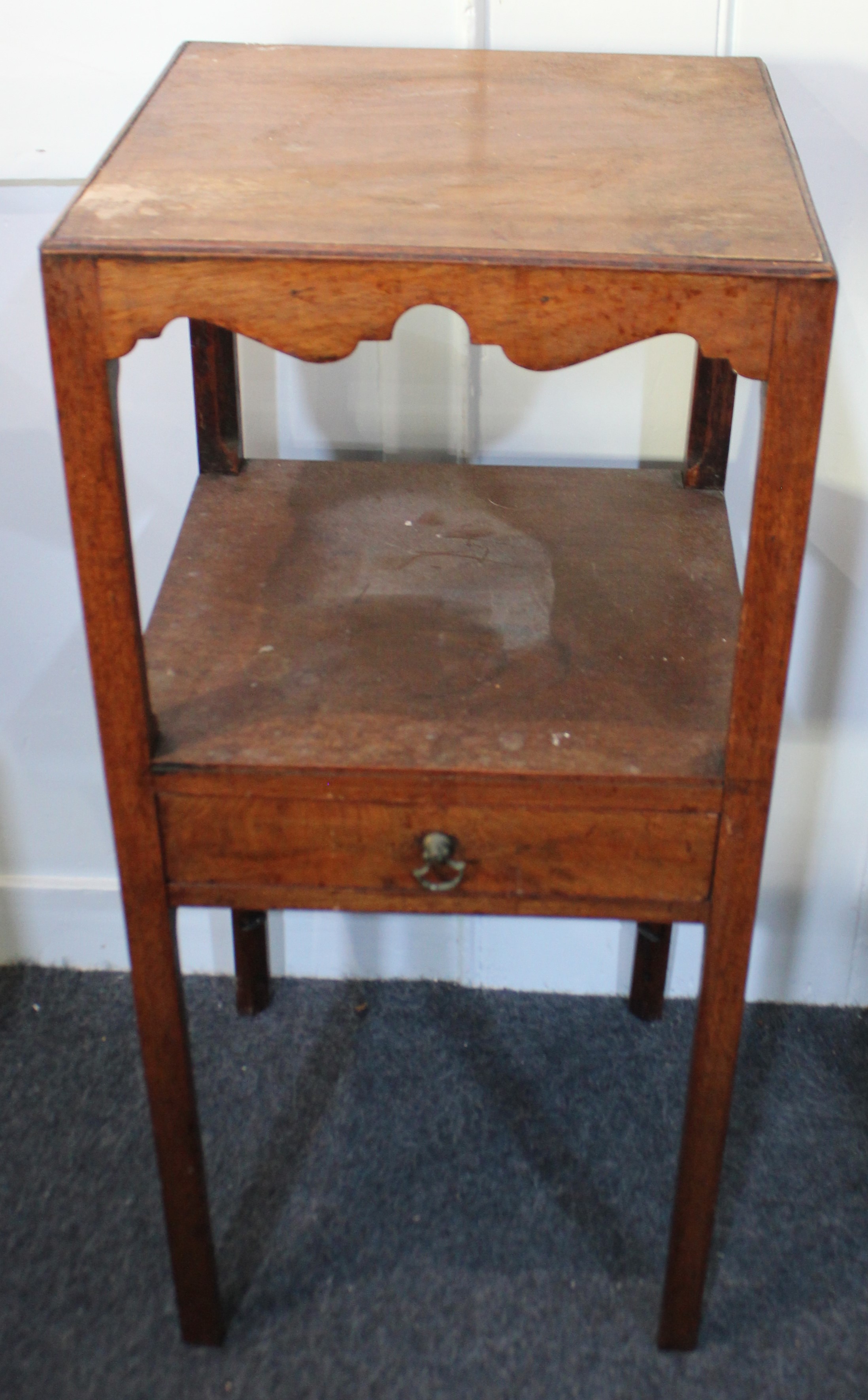 A vintage French marble topped fruitwood bedside cabinet, with single drawer and open shelves, early 20th century, 38cm wide by 75cm high, together with an English George III night stand, c.1780, with two open tiers and single drawer, 36cm wide by 78cm high, (af) (2)