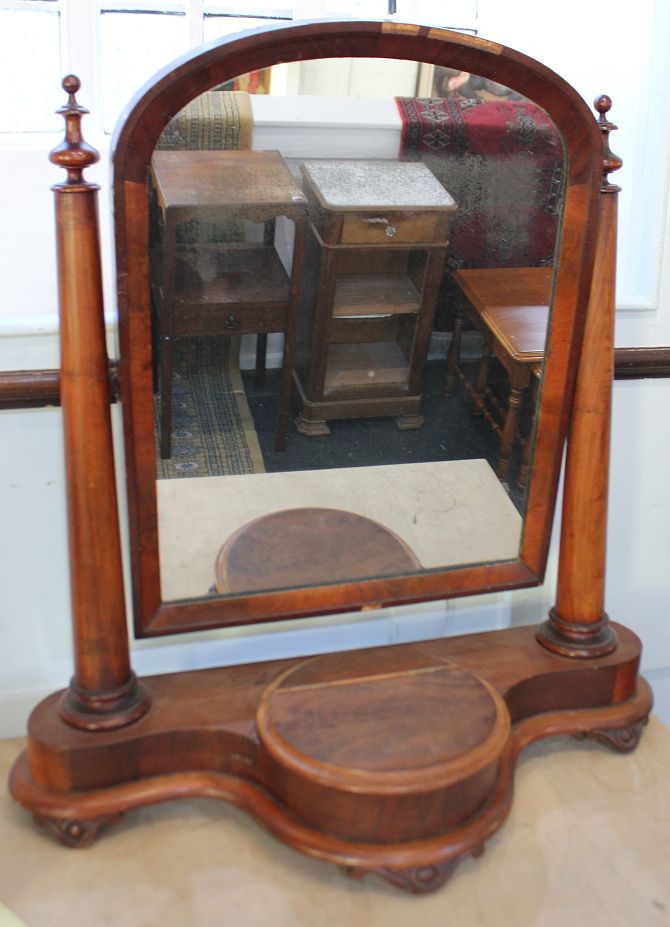 A large 19th century mahogany swing mirror, the domed smirror with original patinated glass, supported by two solid columns and an ornate shaped base with hinged storage recess, 80cm wide by 80cm high, (af).