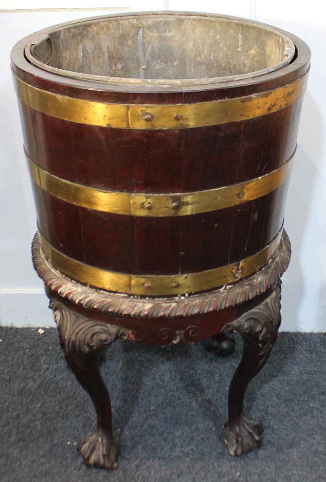 A good quality brass mounted mahogany wine cooler by Spillman & Co of St Martins Lane, London, late 19th / early 20th century, with removable metal liner, carved gadroon lower border, and raised on four substantial cabriole supports with accanthus carved knees and claw and ball feet, 70cm high by 44cm diameter.