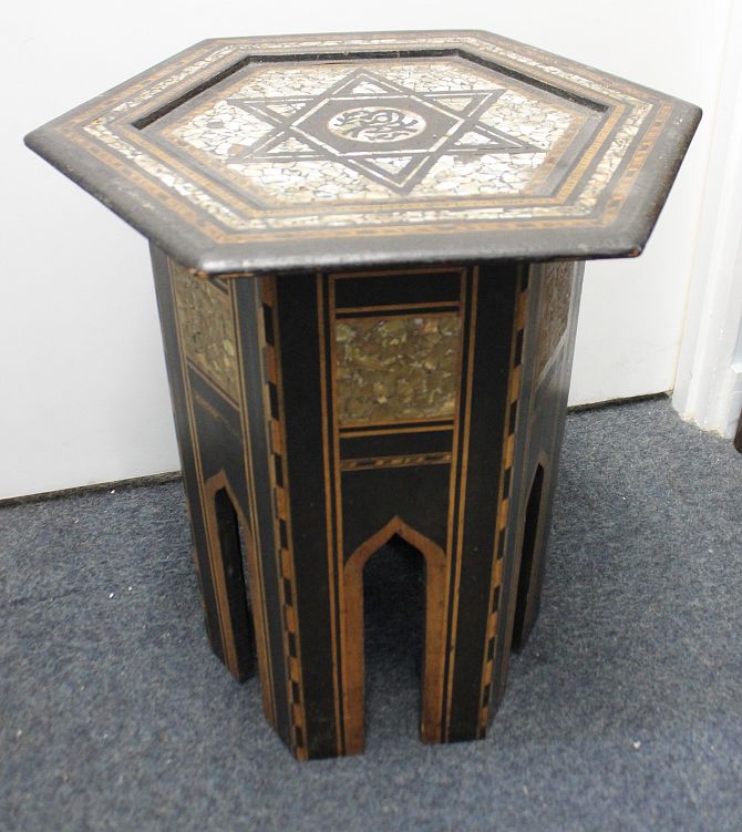 A Middle Eastern mother of pearl inlaid and multi wood marquetry inlaid hexagonal side table, possibly Damascus, late 19th / early 20th century, 40cm wide by 52cm high.