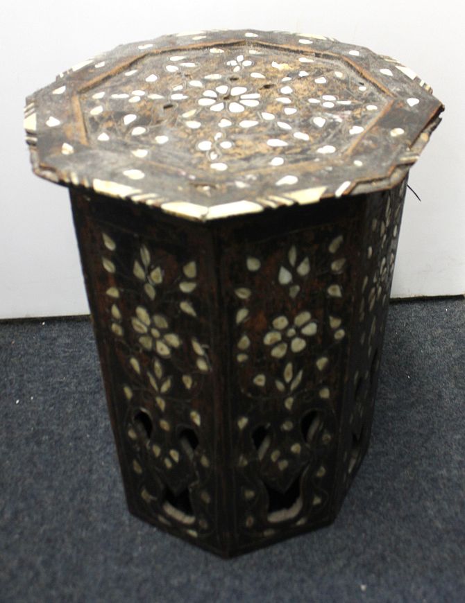 A Middle Eastern mother of pearl and bone inlaid octagonal wooden side table, probably Damascus, late 19th / early 20th century, with old Liberty's of London label to underside, 36cm wide by 47cm high, (af).