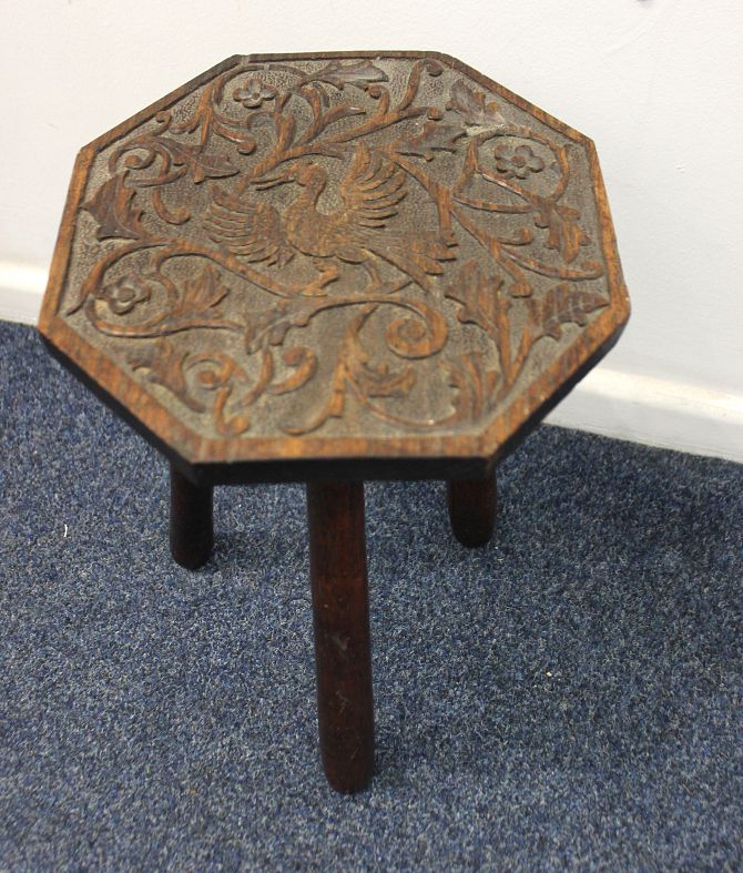 An Arts & Crafts carved wooden stool, c.1900, the octagonal top carved with a Phoenix amidst meandering stylised foliage, 25cm wide by 40cm.