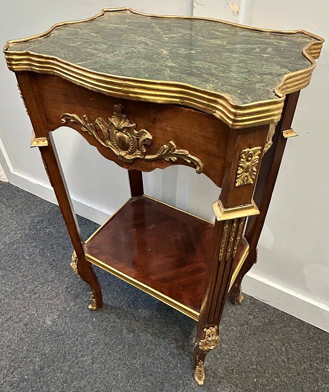 A Louis XV style gilt metal mounted two-tier side table, with marble top on reeded legs to scroll sabots 78cm high, 42.5cm wide, 31.5cm deep