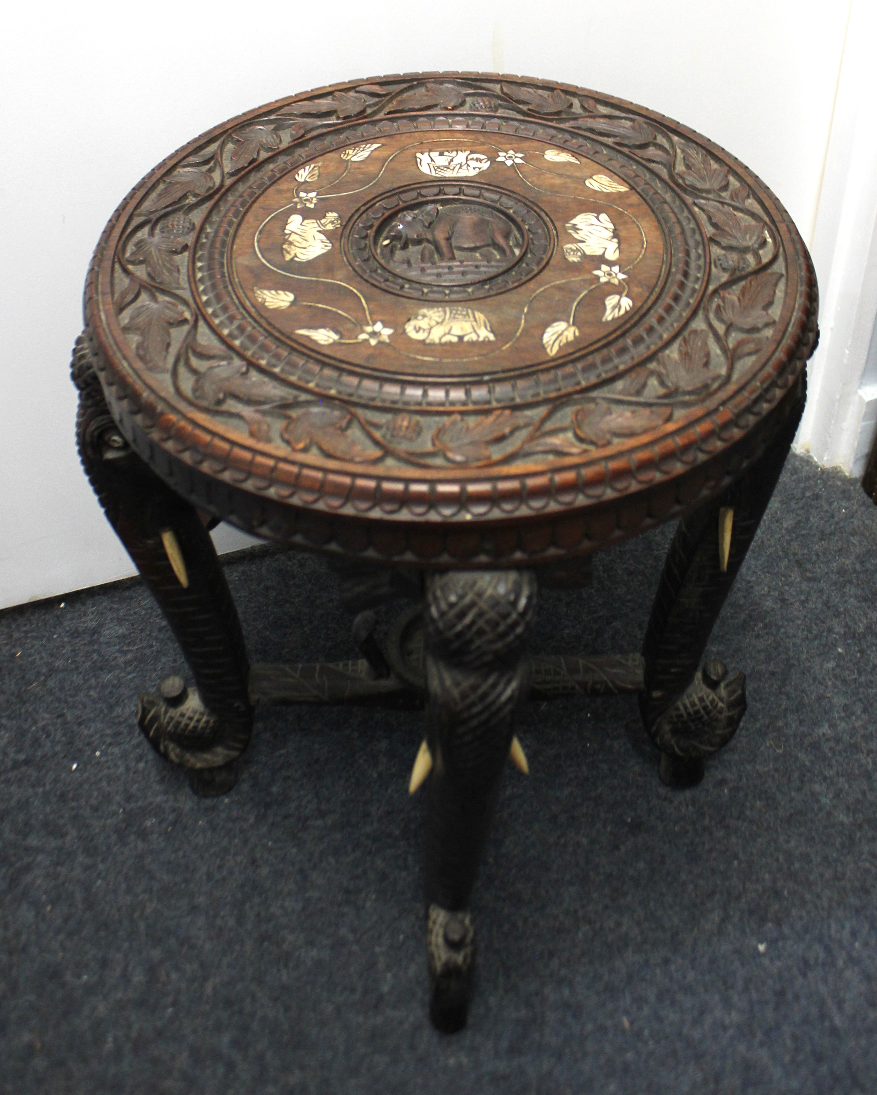 An Anglo Indian carved hardwood side table, late 19th / early 20th century, with decorative marquetry bone inlay depicting elephants and camels, raised on three elephant supports, 42cm diameter by 48cm high (joints loose).