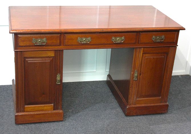 An early 20th century mahogany pedestal desk with rectangular top above an arrangement of three drawers on pedestal supports each with panel door enclosing shelves, on plinth base and castors, 74cm high, 124cm wide