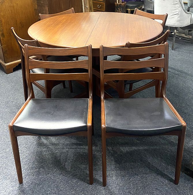 A vintage Danish teak dining table and six chairs, the extending circulatr table on central column and outsplayed supports, with two extra leaves, 120cm diameter extending to 210cm by 120cm, the six chairs with triple bar backs and black leatherette seats, table bears ' Danish Furniture Makers Control' stamp.