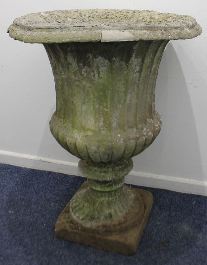 A reconstituted stone garden urn in the Georgian style, 20th century, 78cm high, (af old damage and repairs, nicely weathered and patinated).