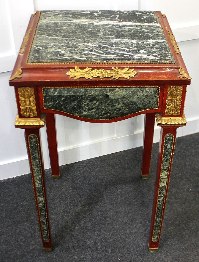 A period style ormolu and marble mounted mahogany side table, 20th century, with hidden frieze drawer, 51cm square by 83cm high.
