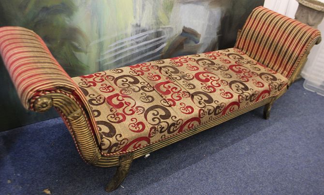 A Regency style chaise lounge, 20th century, being of double scrolled end form with a jazzy upholstery and Egyptianesque giltwood frame, 234cm wide (7' 8").