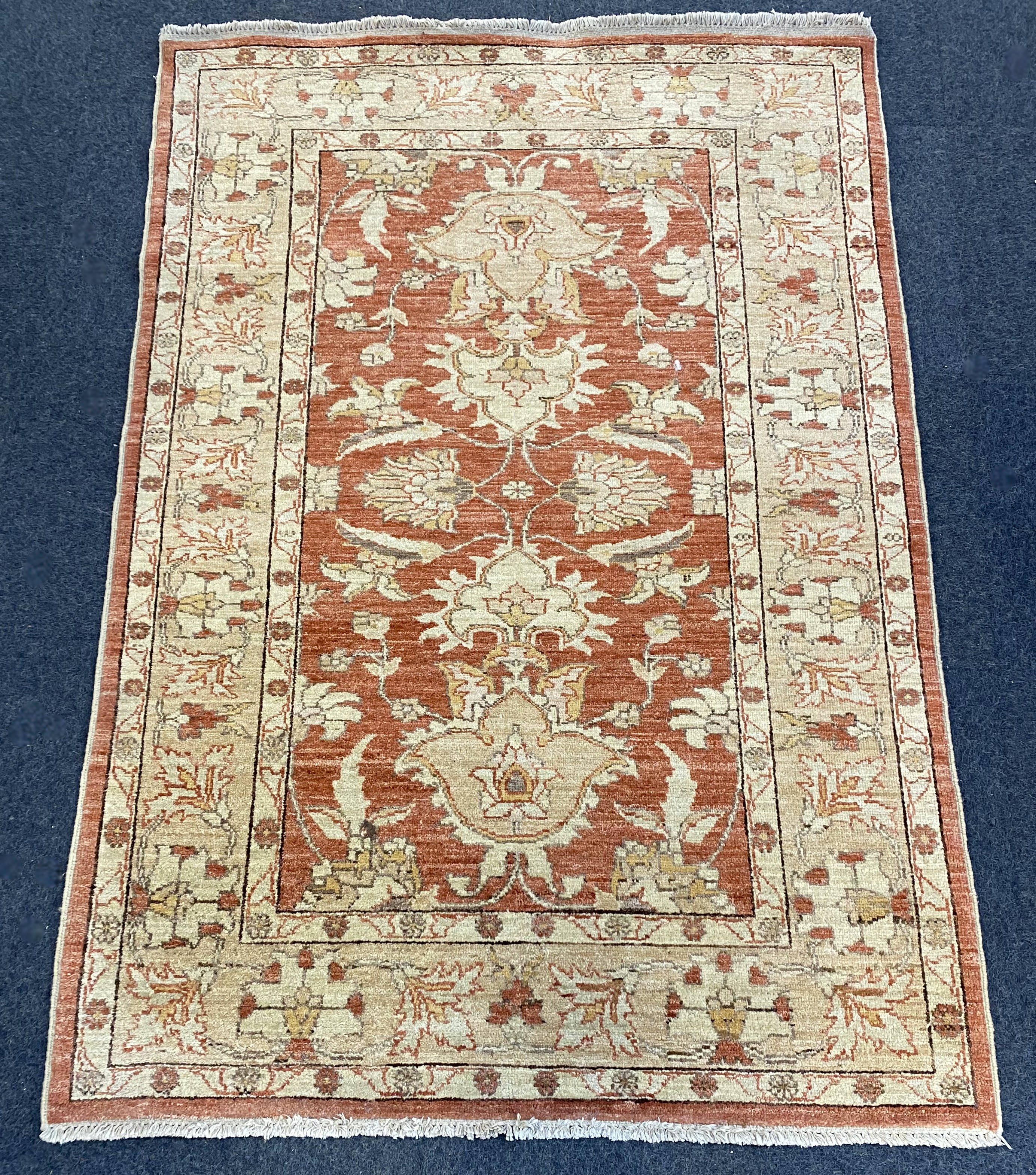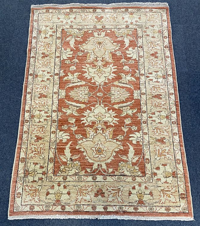A 20th century Afghan Ziegler style rug, red ground with scrolled floral designs in gold within a large border 183cm by 122cm
