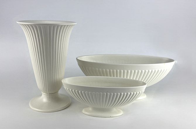 Three Wedgwood & Barlaston of Etruria moonstone white ribbed vases tallest 20cm high