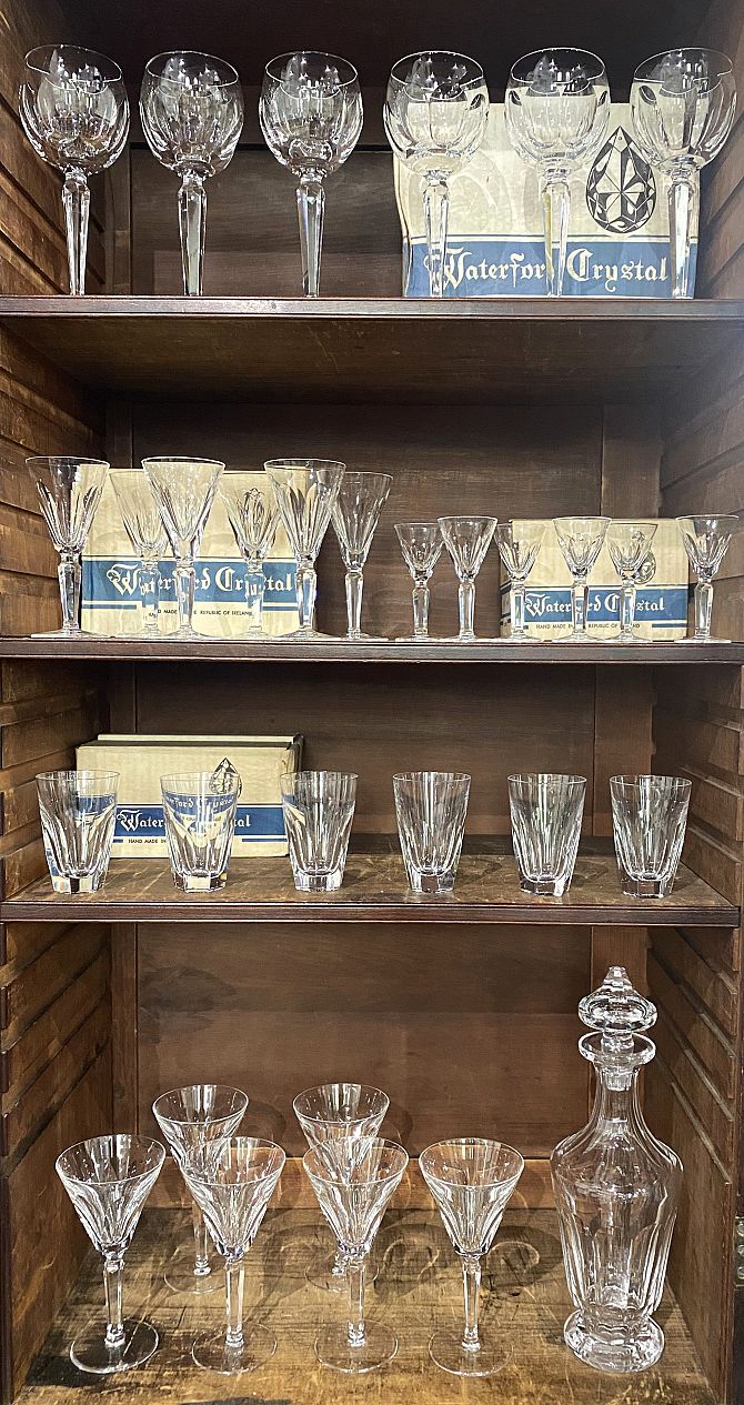A Waterford crystal 'Sheila' pattern part suite of drinking glasses comprising decanter, six boxed hock glasses, six boxed sherry glasses, six boxed liqueur glasses, six boxed 5oz tumblers and six white wine glasses