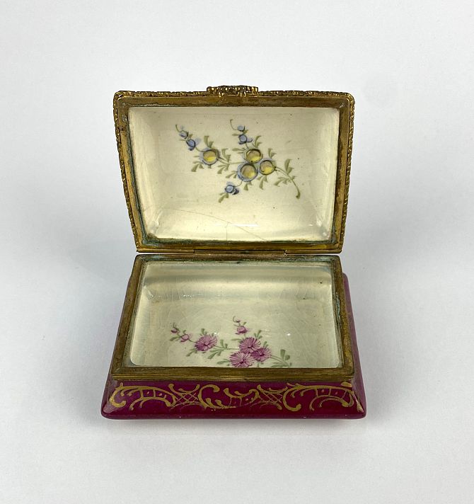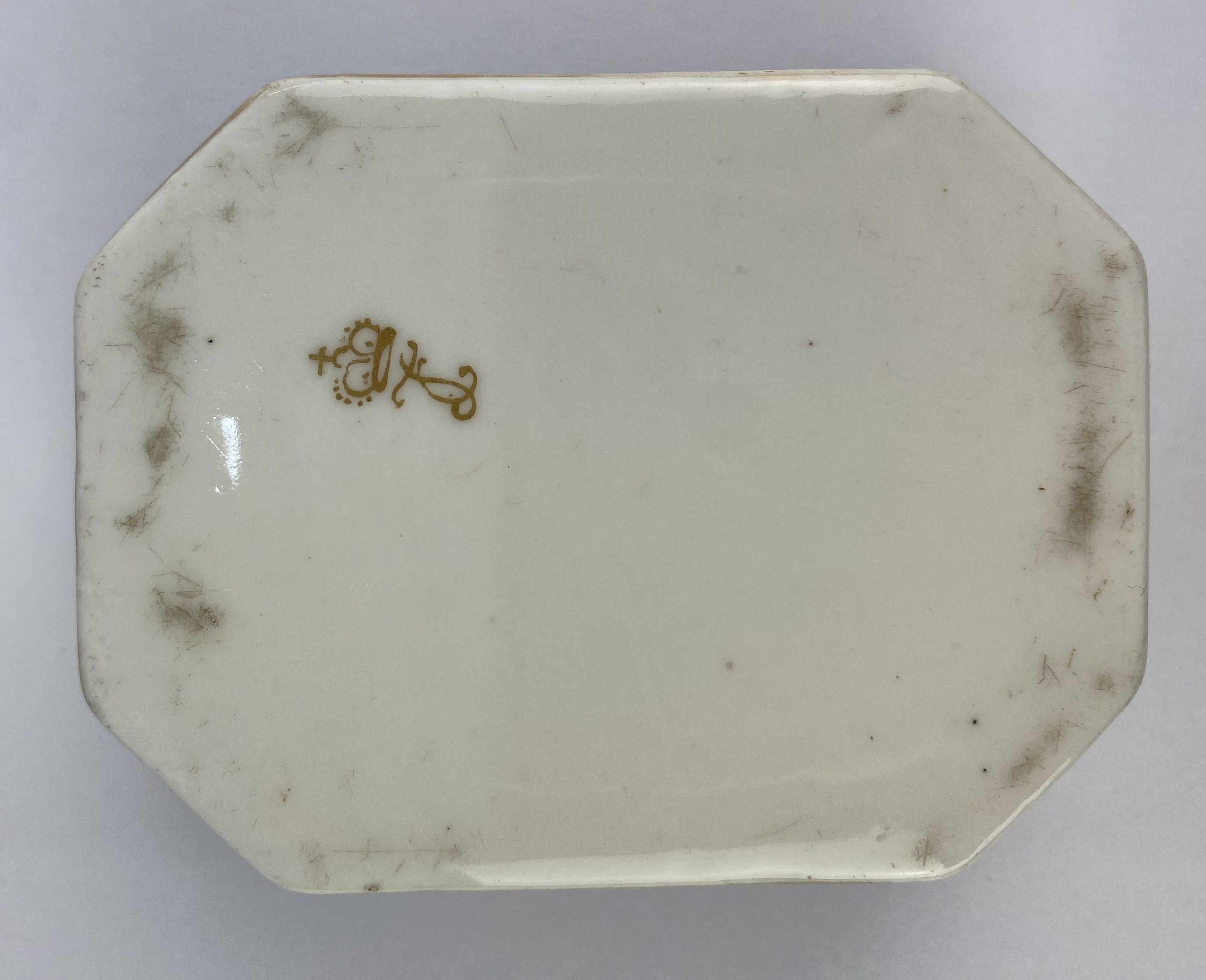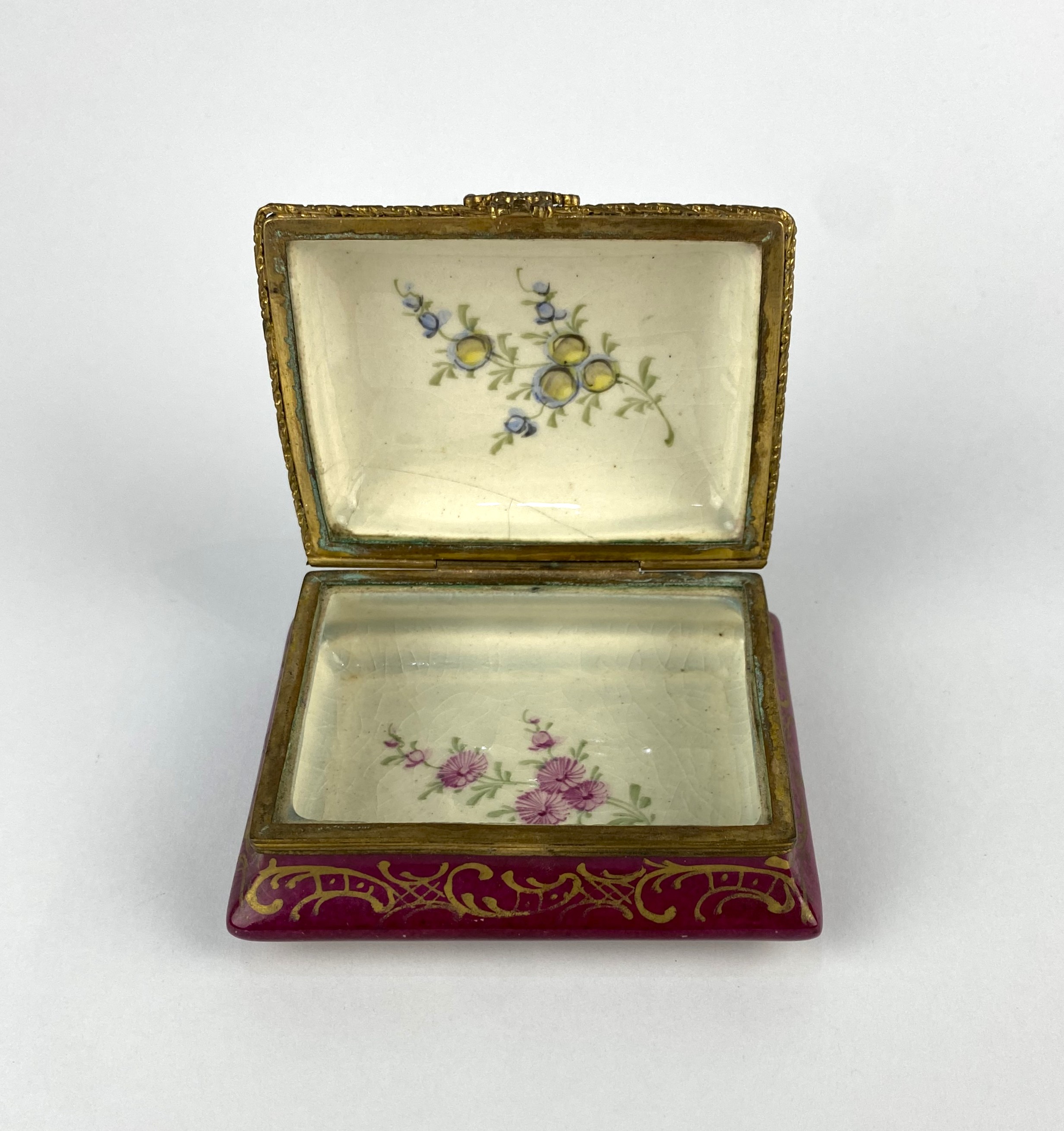 A 19th century continental porcelain trinket box, of canted rectangular form, decorated against the white ground to to lid with figural scene of piper and maiden within a landscape, exterior decorated with floral sprays, bearing Frankenthal type mark to base, width 9cm, together with a contiental porcelain trinket box, gilt decorated against maroon ground, to lid with painted floral panel, underglazed blue scissor mark to base (AF), width 9.5cm (2)