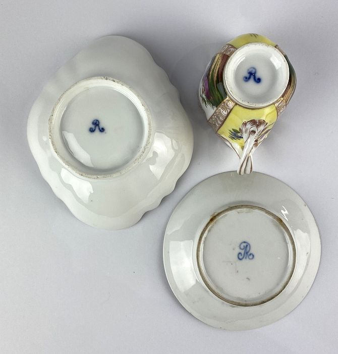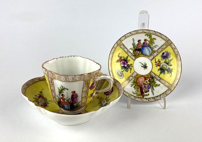 A Dresden/ Helena Wolfsohn type porcelain cabinet cup and saucer, each decorated with panels of courting couples and floral scenes, against a yellow ground, gilt heightened, underglazed blue 'R' to base, quatreform saucer diameter 13.5cm, together with an Augustus Rex type saucer, similarly decorated (AF), diameter 11cm (3)
