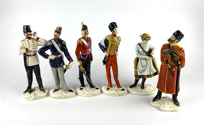 A collection of six Cacciapuoti Italian porcelain military figures, including female figure with barrel, grenadier guard and other Napoleonic figures, each with inscised signature to base, the largest height 22.5cm (one AF)(6)