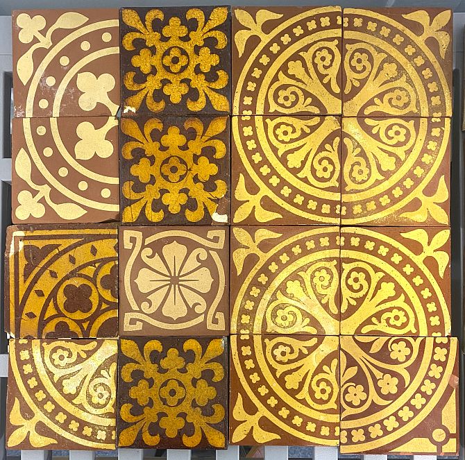 Sixteen encaustic tiles to include Craven Dunnill & Co Jackfield, each with buff design on terracotta ground