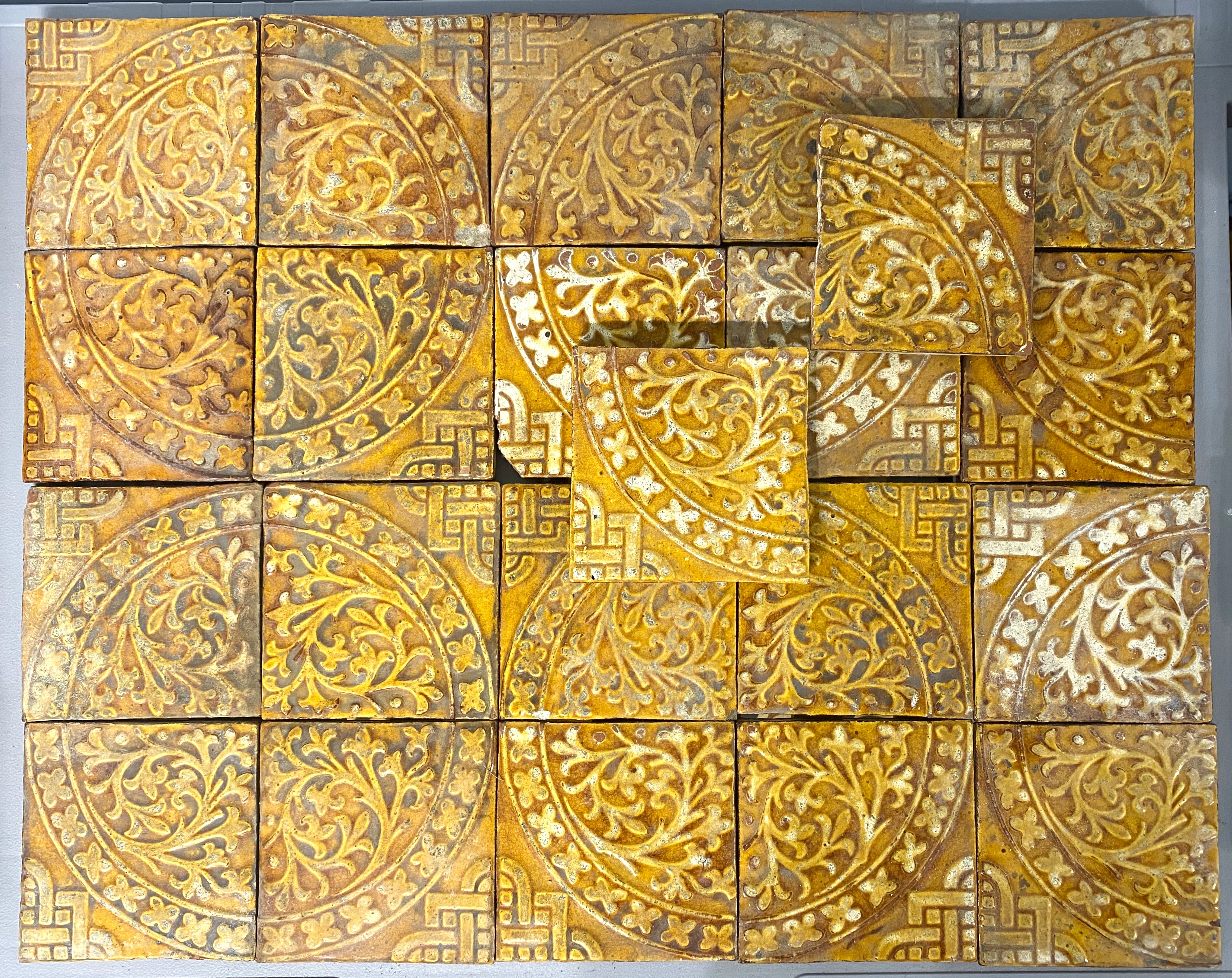 Twenty-two Craven Dunnill & Co glazed yellow tiles with repeating design of buds in a circle forming a panel of four tiles, 10.7cm by 10.7cm