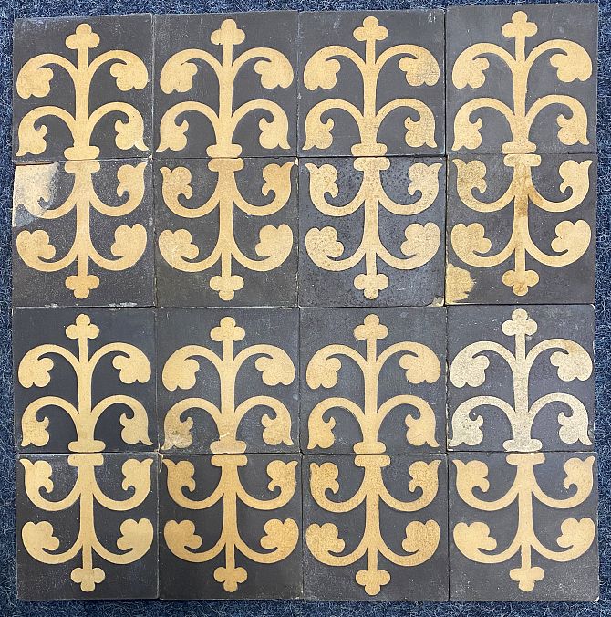Fifty-four encaustic border tiles with black and buff scrolling design, 7.7cm by 7.7cm