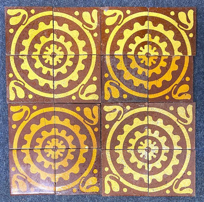 Four groups of four Craven Dunnill & Co encaustic tiles (sixteen total), with flower and circle design in yellow with red brown background 11.3cm by 11.3cm