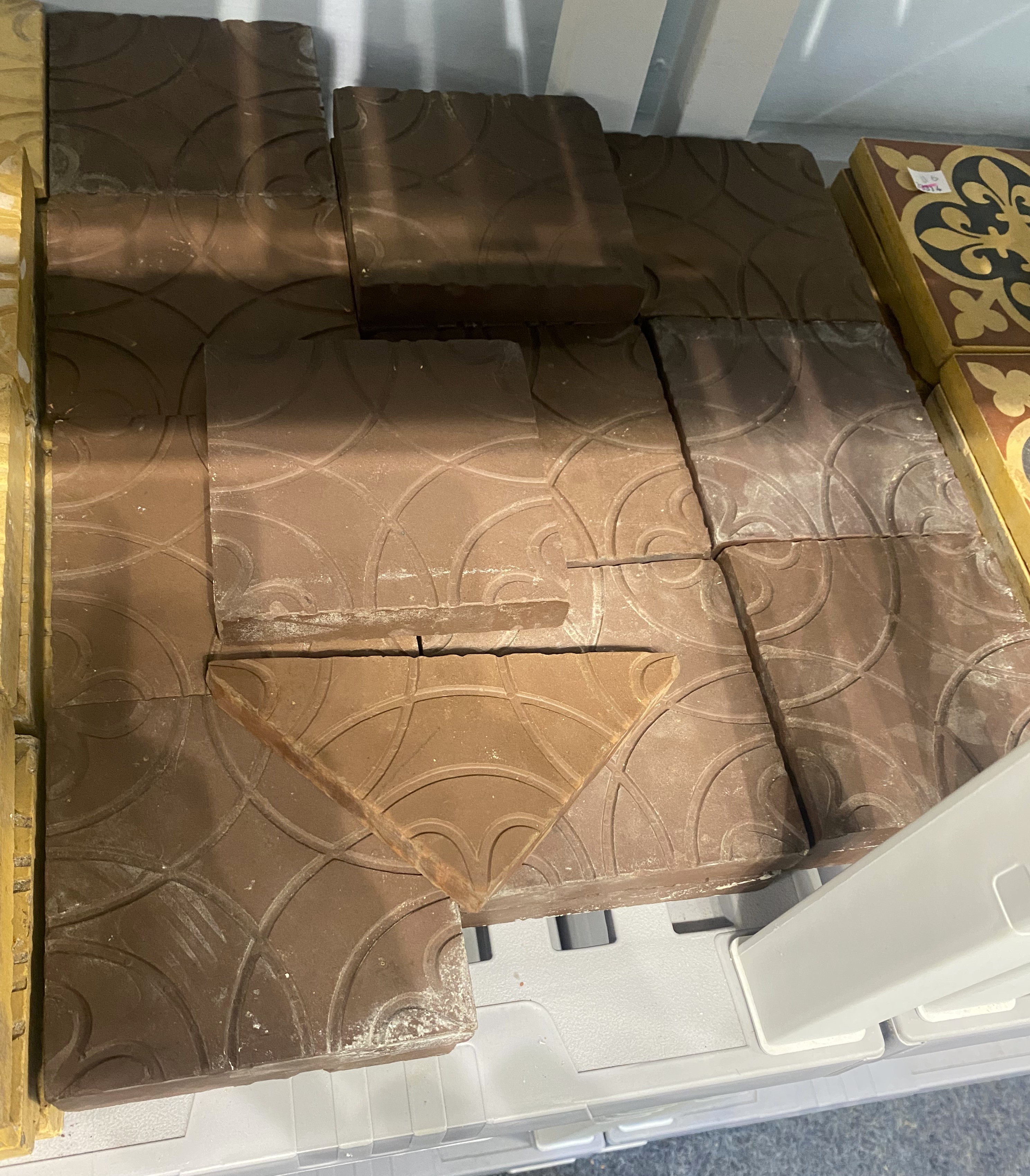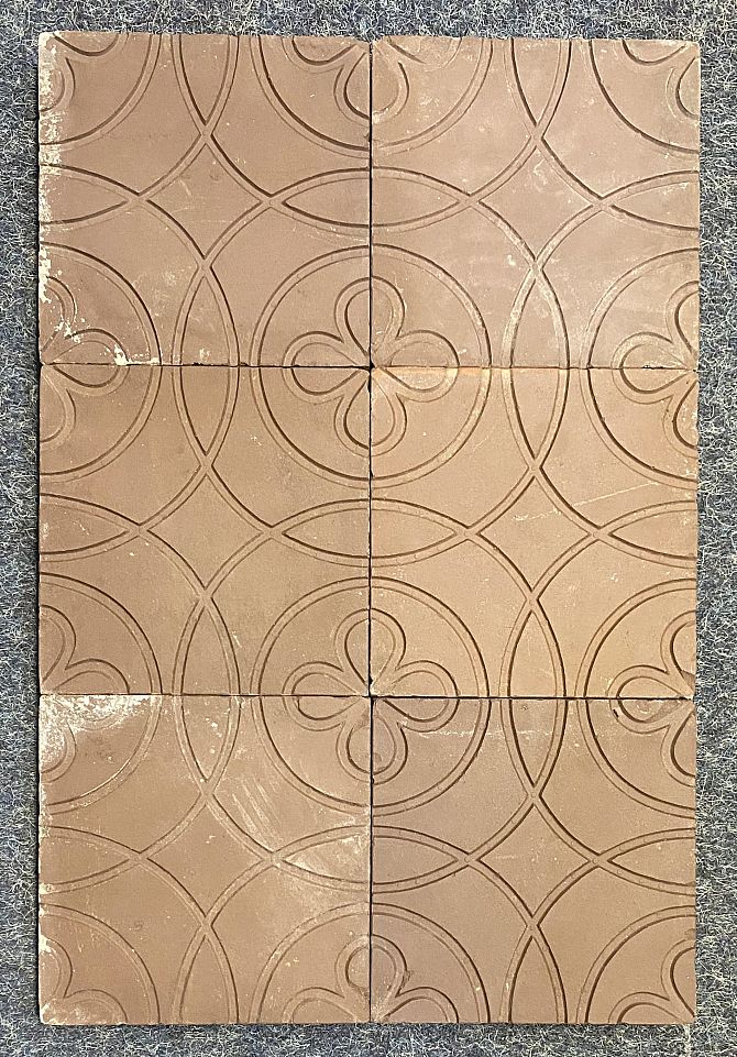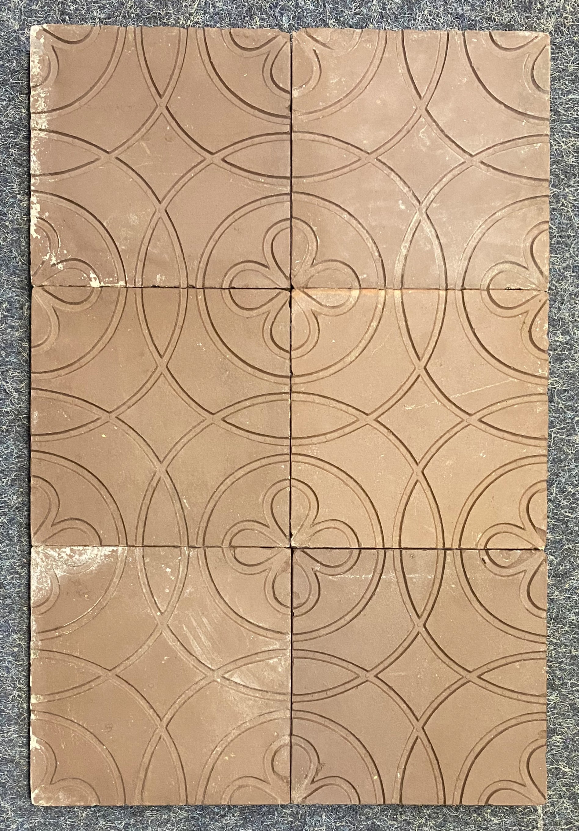 Twenty-two dark red/ brown tiles inset with flower and circle design, 12.7cm by 12.7cm, and one corner section