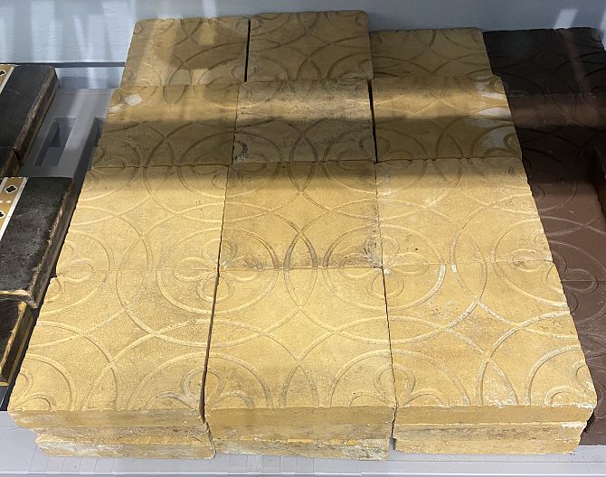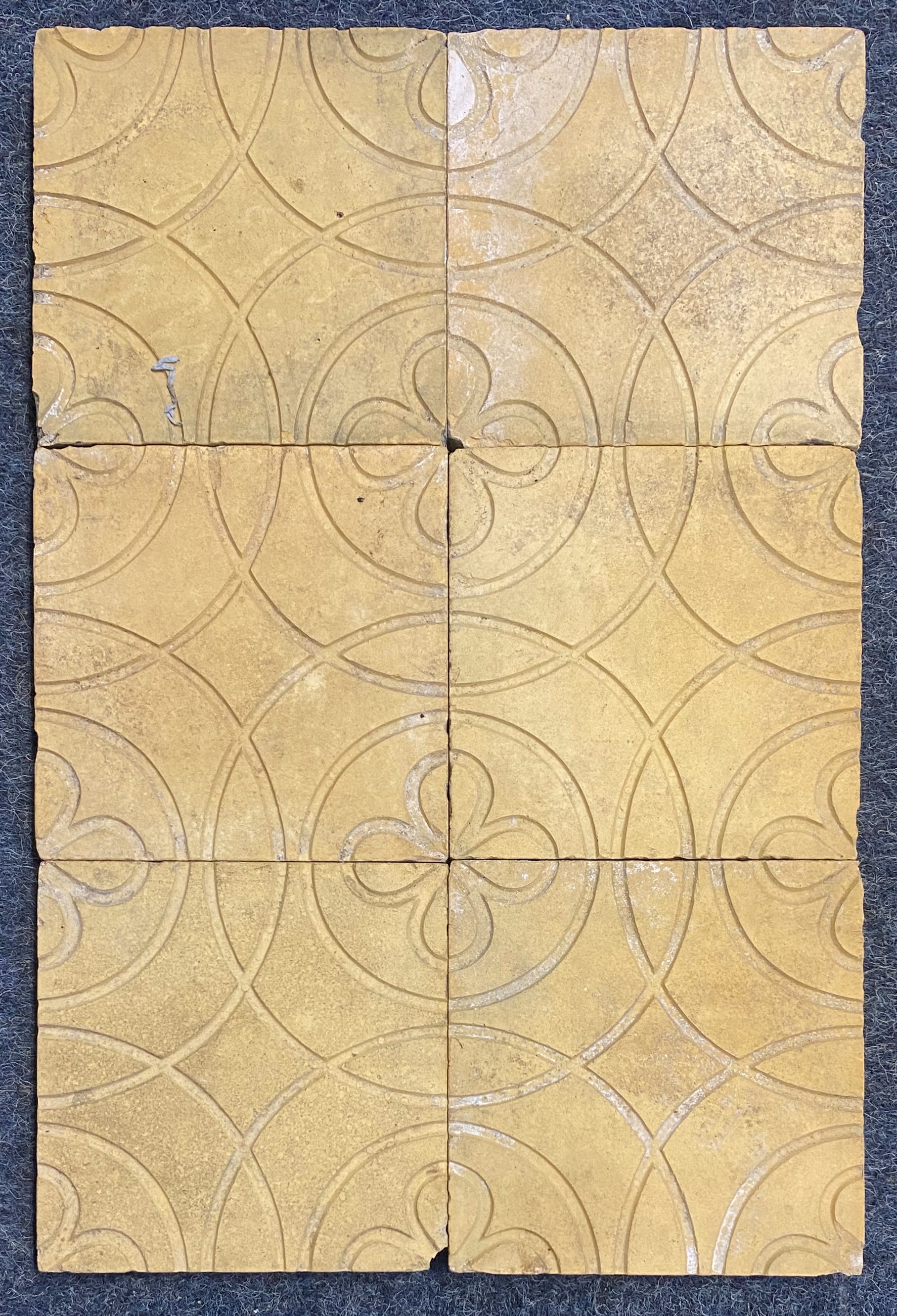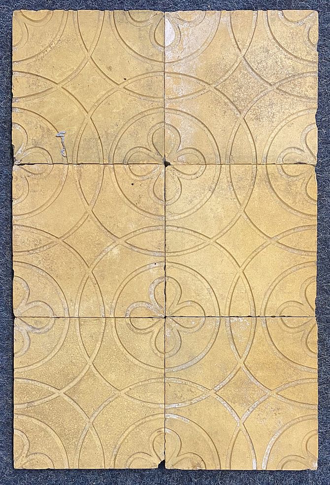 Thirty-five buff coloured tiles with inset grooved design of flowers within circles, 13cm by 13cm