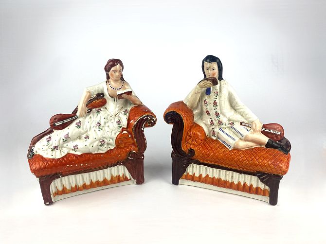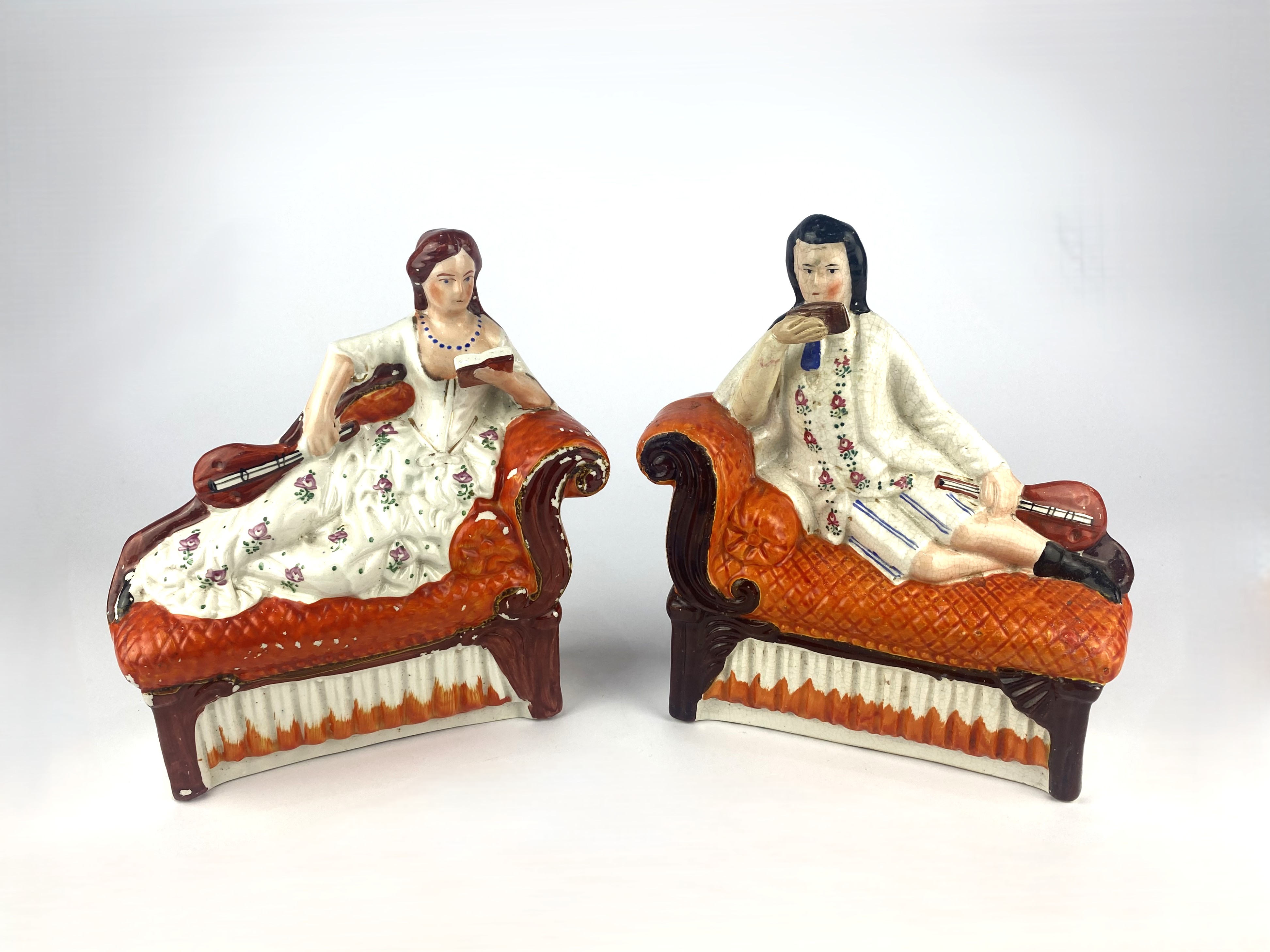 A pair of Victorian Staffordshire pottery figures depicting a male and female figures reclining on day beds reading books, 21cm wide by 23cm high, (af - damaged / restored).(af)
