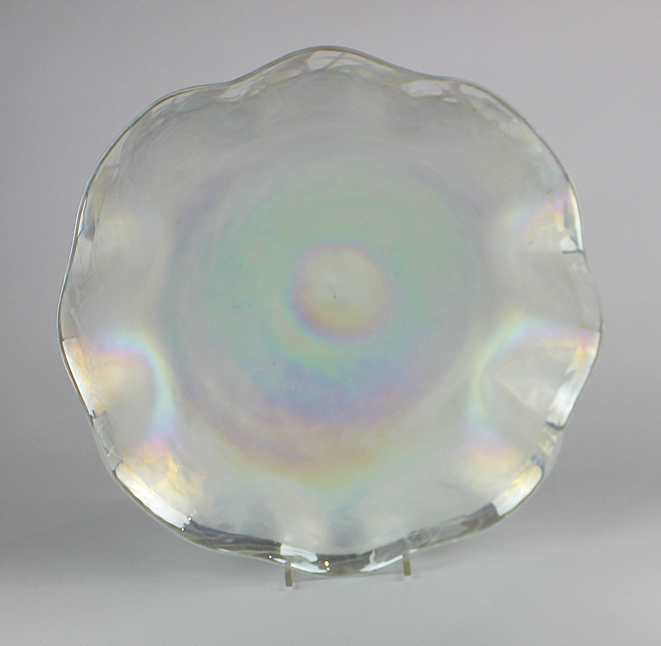 A large Murano iridescent glass bowl with wavy rim, Murano label to base, 39cm diameter