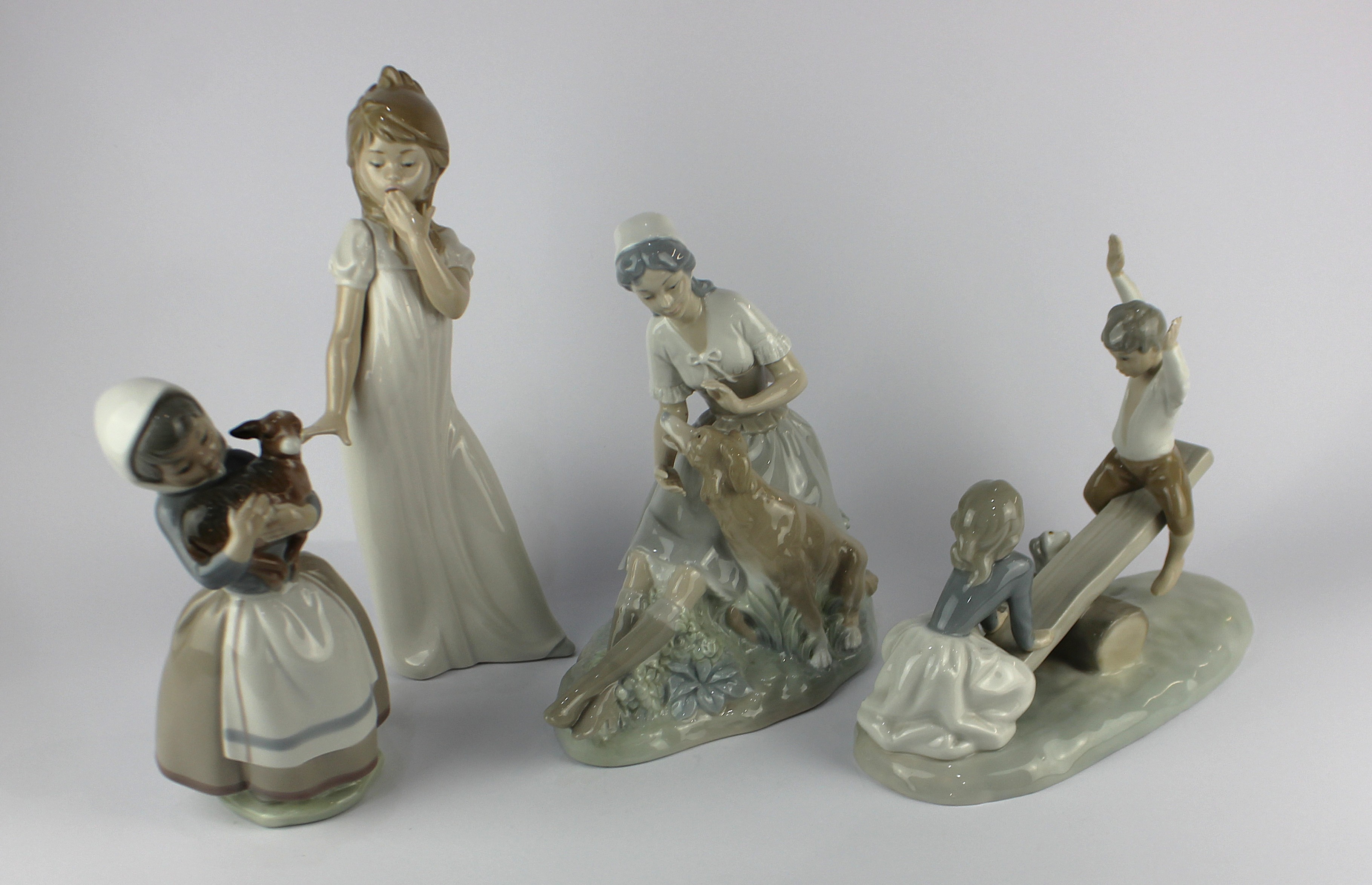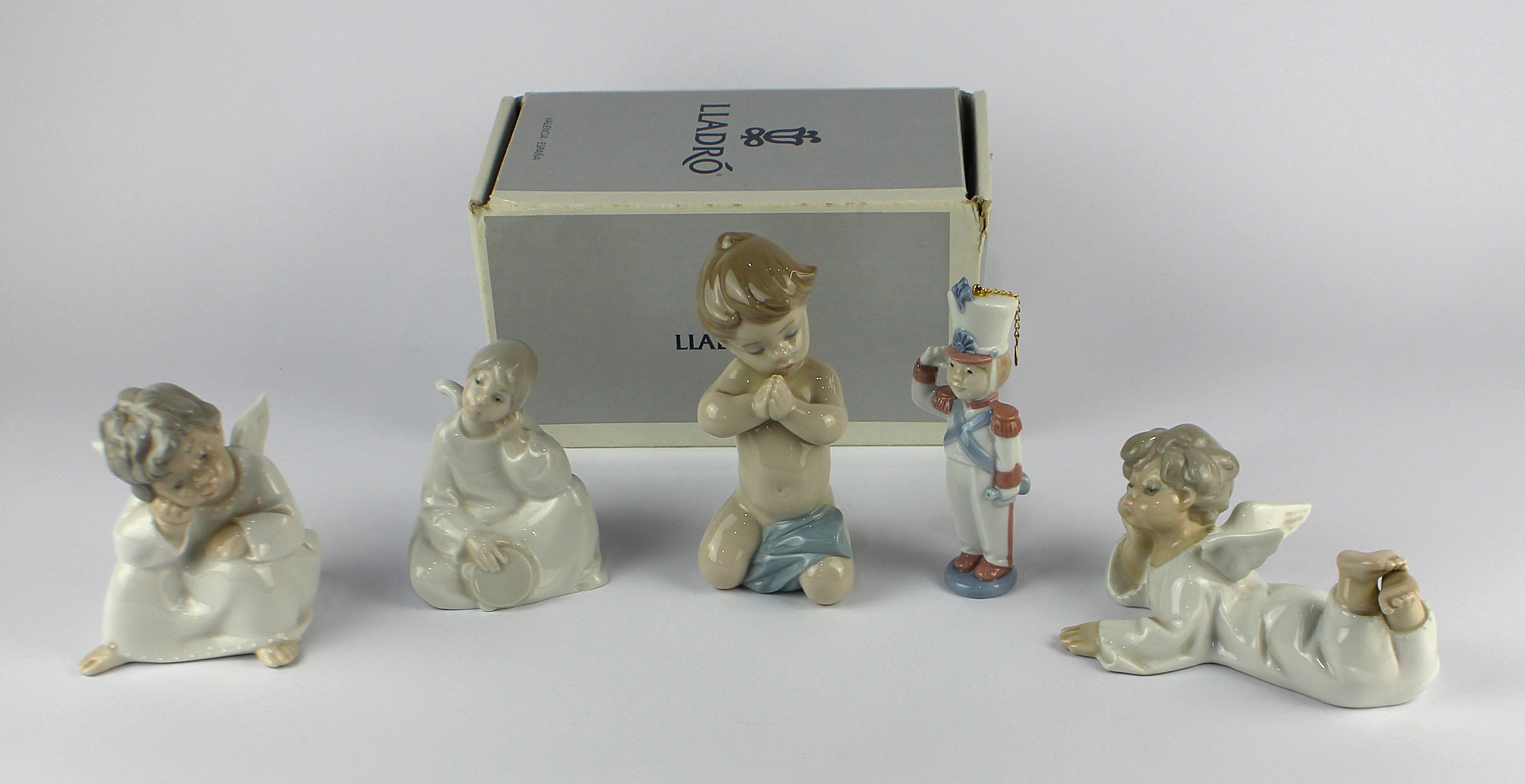 A Lladro porcelain figure group 'A Child's Prayer', 06496, together with a Nao figure of a seated angel with tambourine, a Lladro figure of a recumbent angel, a Lladro figure of a seated angel and Lladro Toy Soldier Christmas ornament, height 13cm (5)