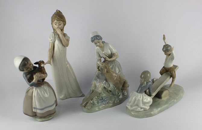 A Nao figure of a seated female figure with a hound dog, Made in Spain, height 25cm; together with a Nao figure of a girl wearing a nightdress, a Rosal Espana figure group of childen on a see-saw, and a Nao figure of a little girl holding a lamb, height 22cm (4)