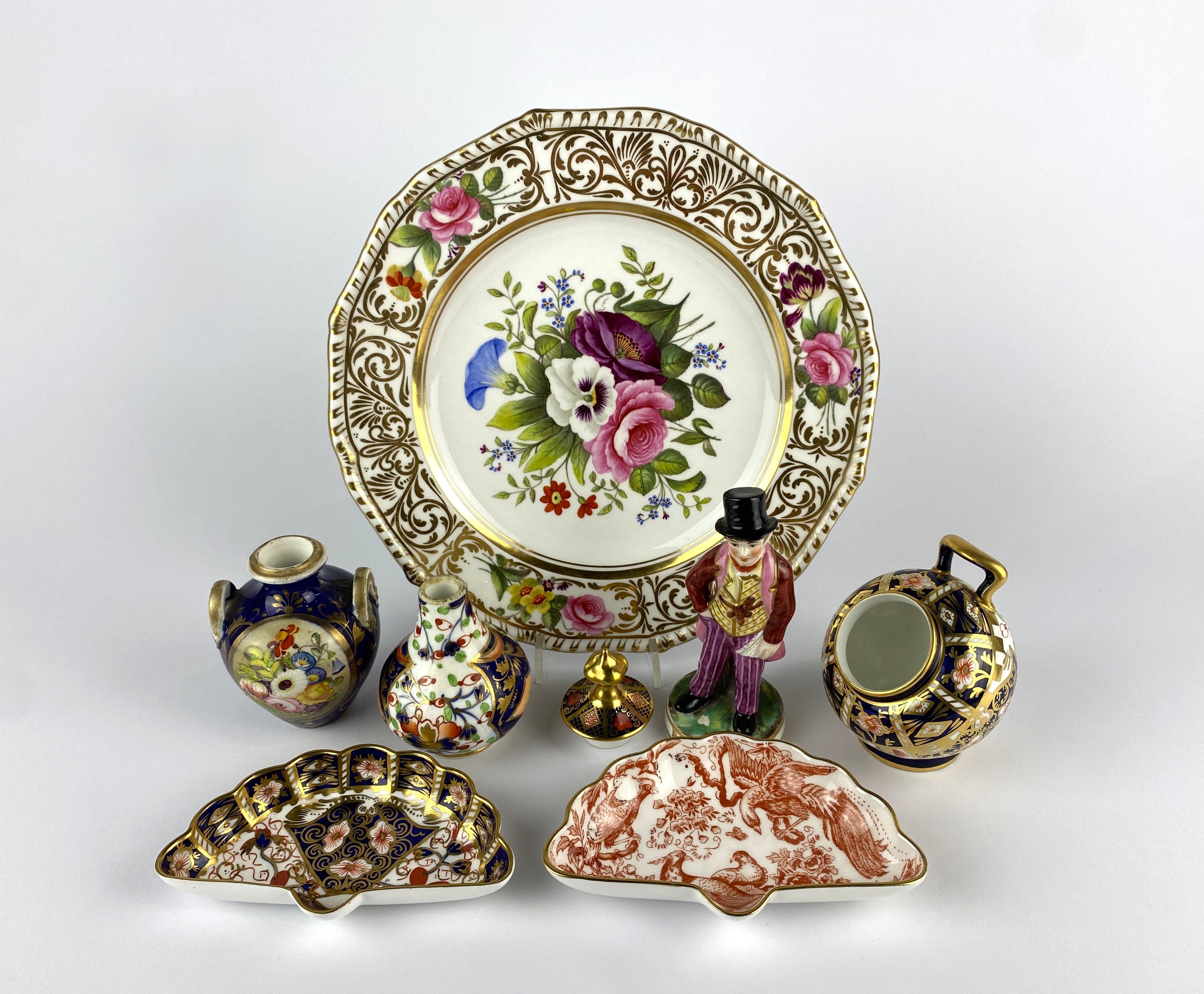 A Stevenson & Hancock Derby 'Belper Joe' porcelain figure, in the form of a newspaper seller, bearing painted mark to base, height 11cm (AF), a Stevenson & Hancock Derby cabinet plate, painted with floral motif, red mark to base and initialled AEB, diameter 22cm (AF), with together with a Derby miniature vase, early 19th century, twin-handled, of baluster form, decorated against a cobalt blue ground with oval floral panel, painted red mark, height 8.2cm; a Derby miniature bottle shaped vase, early 19th century, Imari pattern, painted red mark, height 7.25cm; a Royal Crown Derby salt pig, Imari pattern, red mark to base, numbered 6299, height 9cm; an Imari pattern lid; two Royal Crown Derby fan shaped pin dishes, one 'Red Aves' pattern, the other Imari pattern, numbered 2451 (8)
