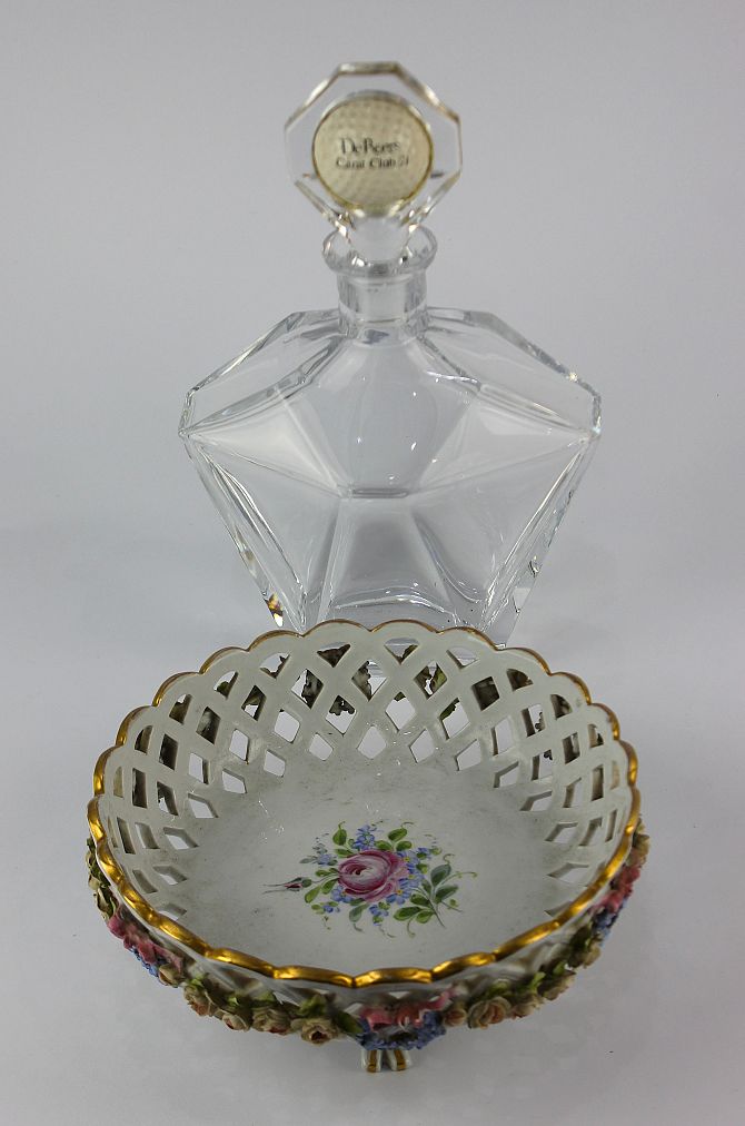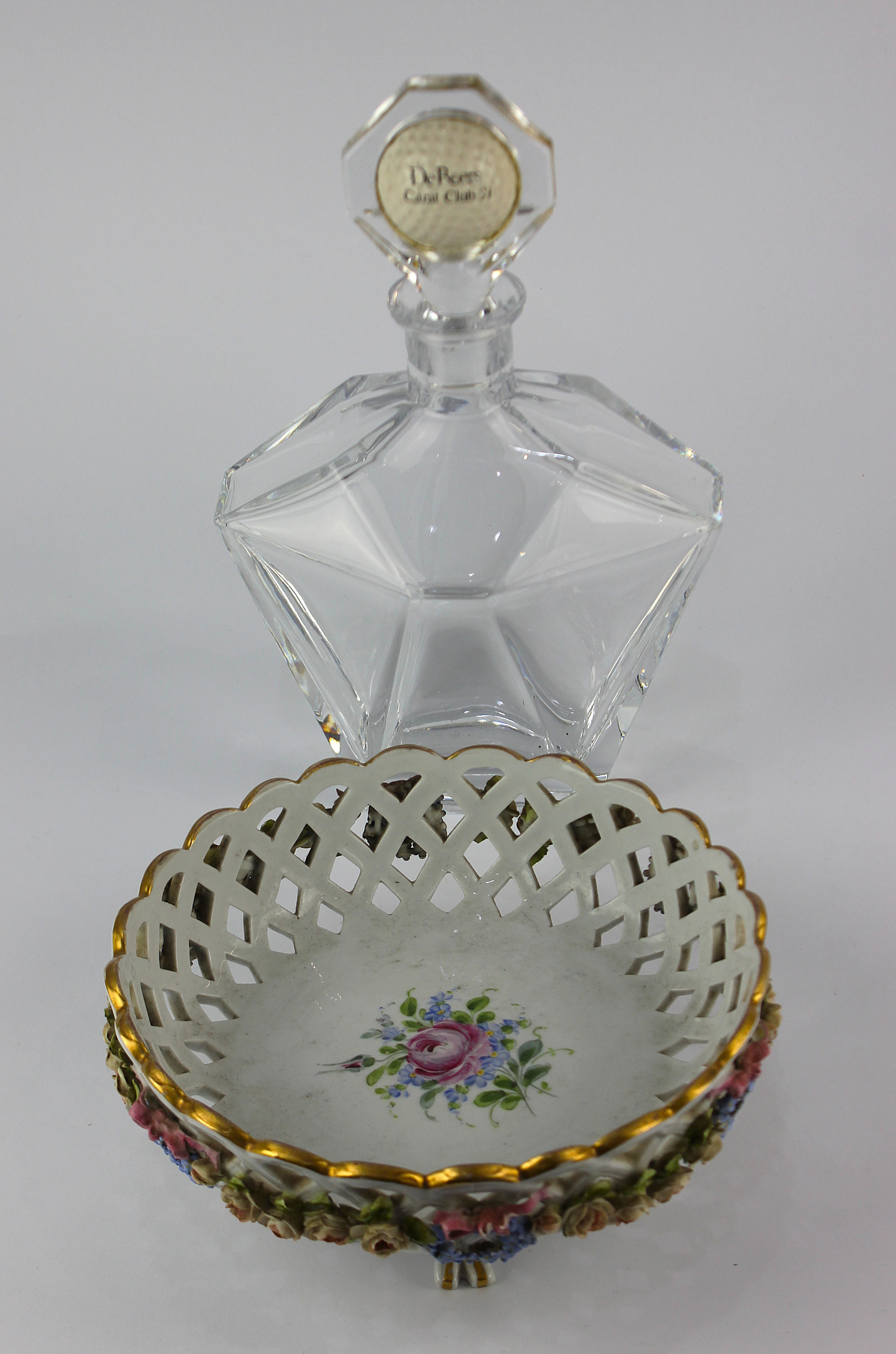 An Atlantic glass decanter, the stopper containing a De Beers Carat Club 91 golf ball, 26.5cm high, and a Von Schierholz German porcelain reticulated bowl with applied and painted floral decoration, on three feet, 18.5cm diameter