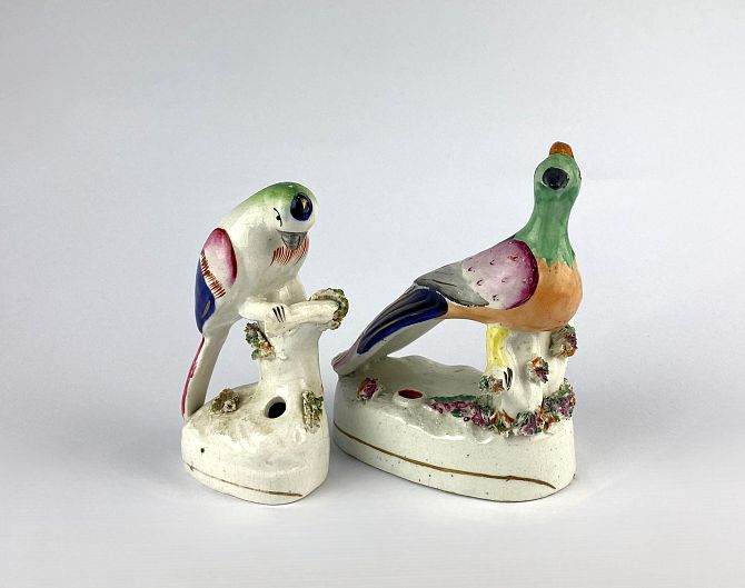Two Staffordshire pottery colourful bird quill holders tallest 14.5cm high