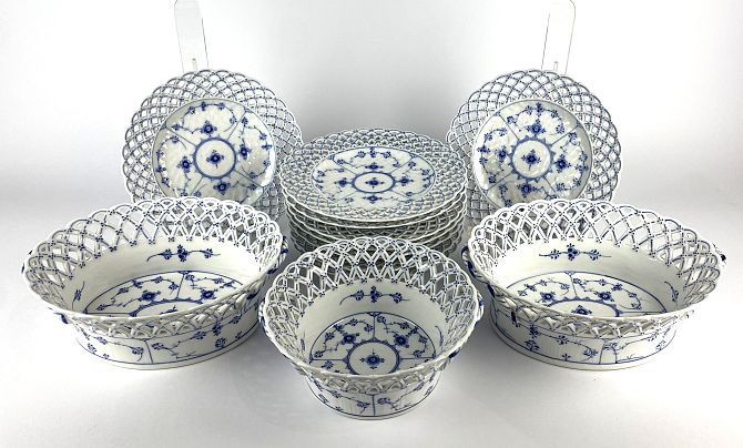 A collection of Royal Copenhagen blue lace porcelain comprising a pair of oval two handled baskets 25cm wide, a circular two handled basket 20cm diameter, and nine plates 21cm, all with wide reticulated borders