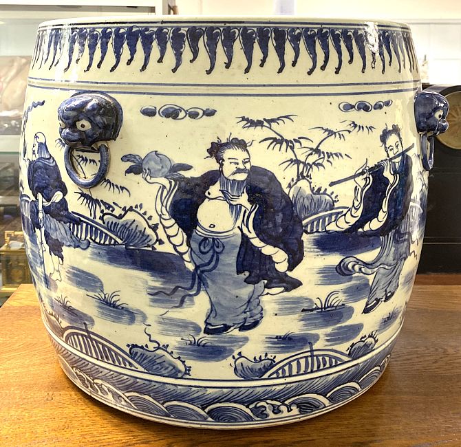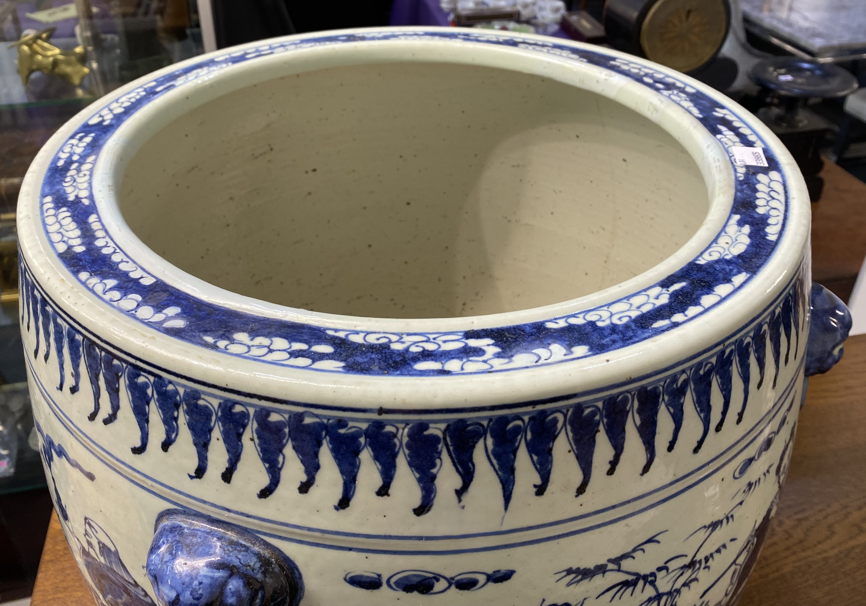 A large Chinese blue and white porcelain fishbowl planter / jardiniere, with hand painted decortation of a continual scene of figues within a landscape, between four relief moulded mask handles, 52cm wide by 40cm high.