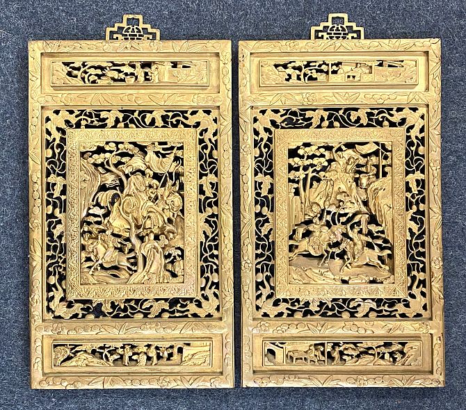 A pair of 20th century Chinese carved wood gilt painted wall panels with pierced figural design 60cm by 34.5cm (a/f)