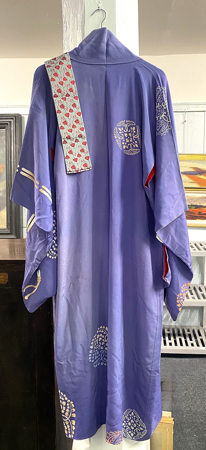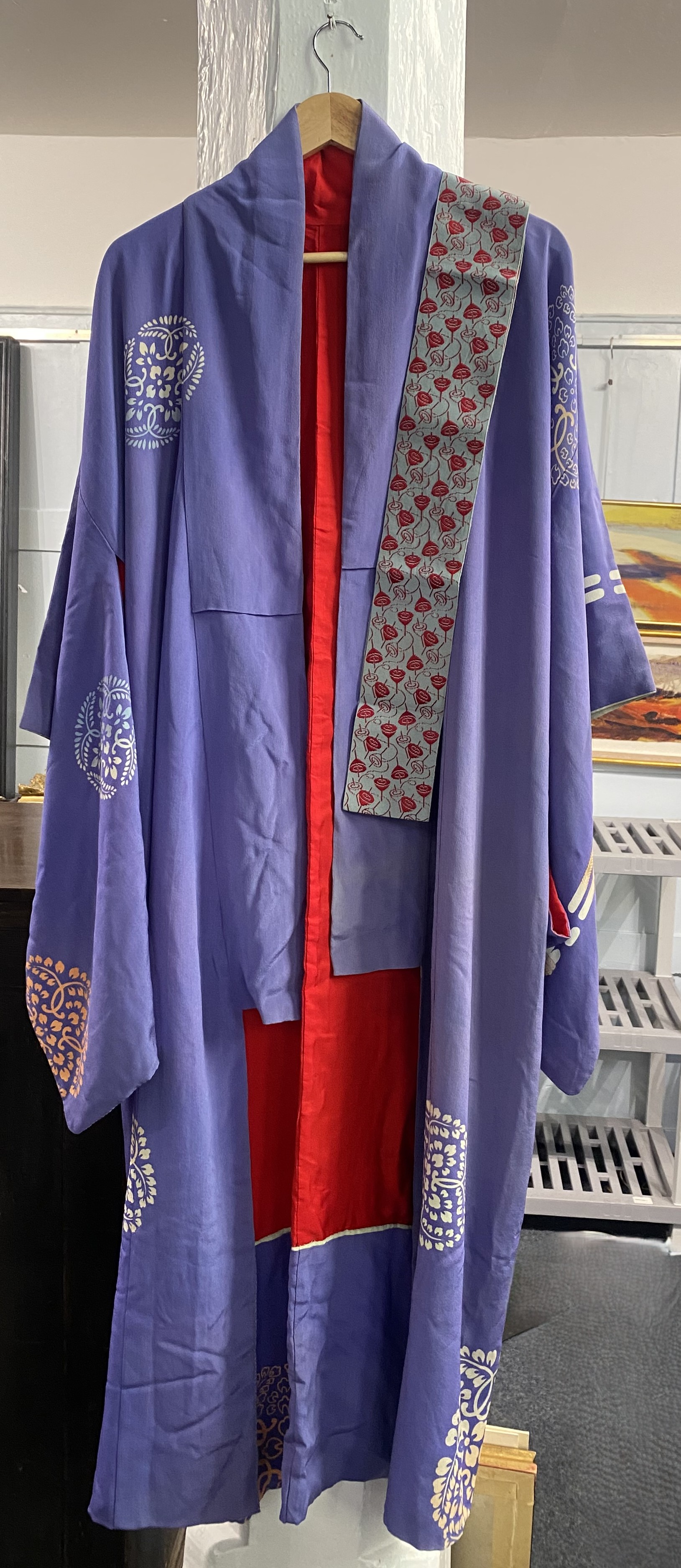 A Japanese purple patterned kimono lined in red silk, with associated belt