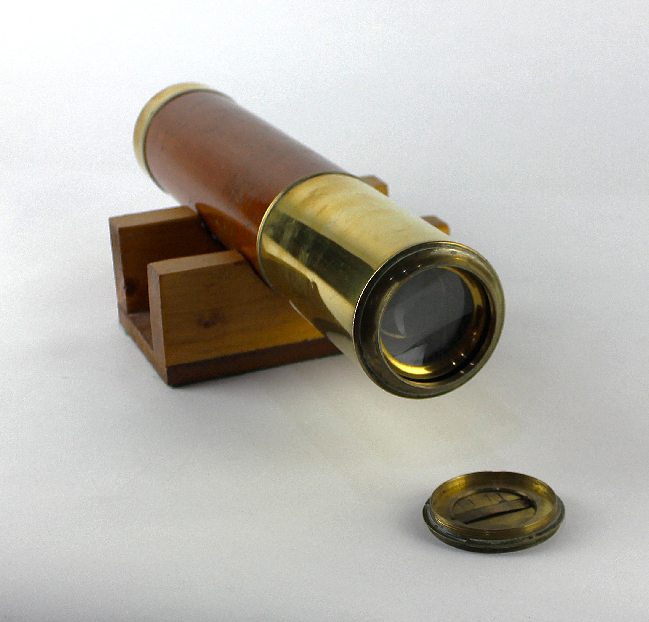 A Harris & Son 'Day & Night' telescope, 19th century, two-draw, with removable lens cover and integral sliding cover, signed, together with an associated stand, compressed length 38.3cm (AF)