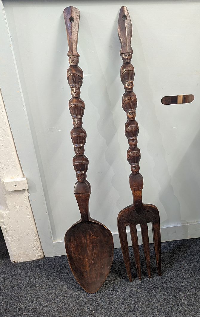 African Tribal Art: a pair of vintage carved wooden oversized spoon and fork, decorated with hand carved crouching figures to the handles, 102cm, (2).