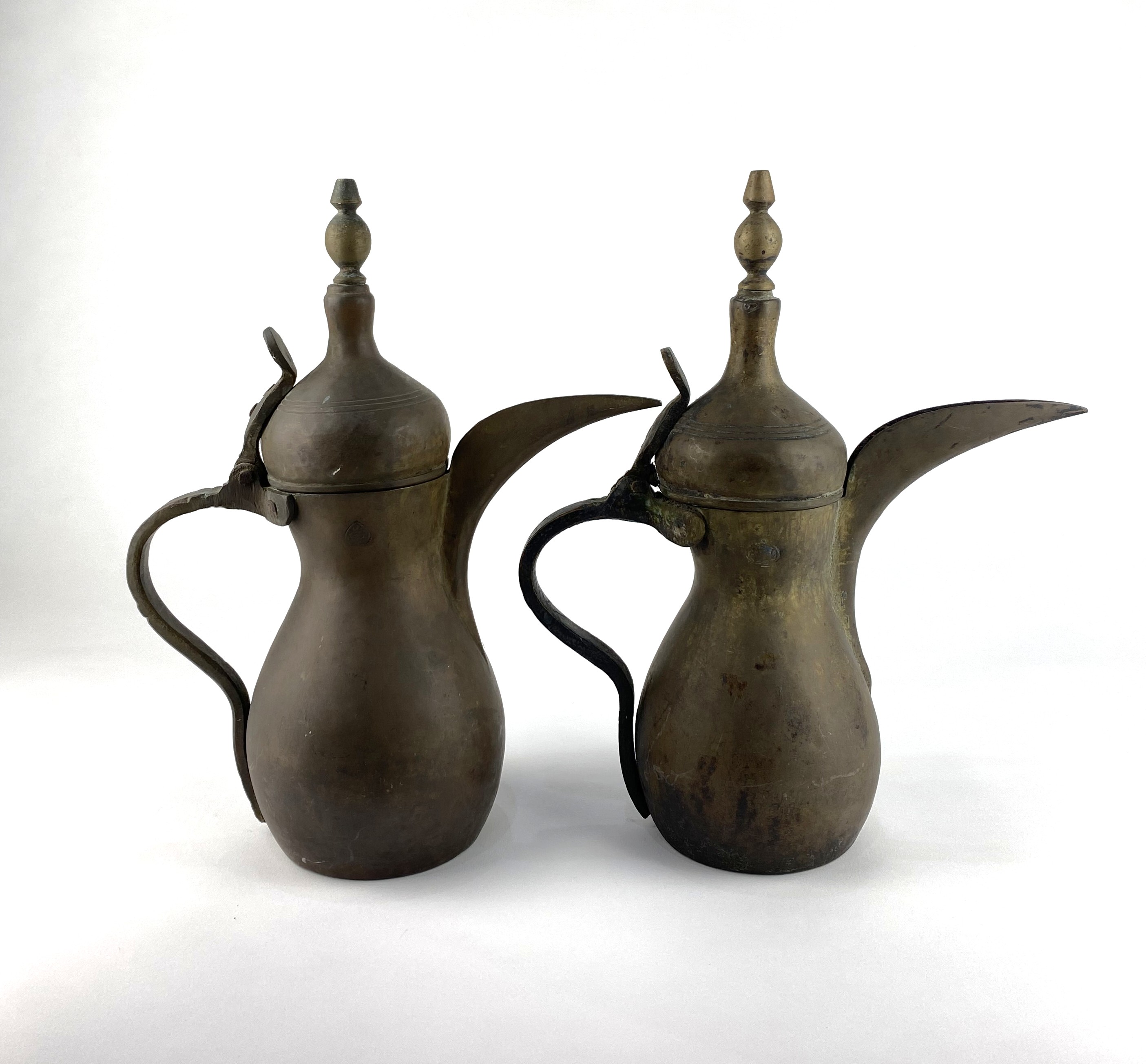 Two Middle eastern Persian brass Dallah's (coffee pots), with hinged lids, both with impressed marks, each approx 30cm high, (2).
