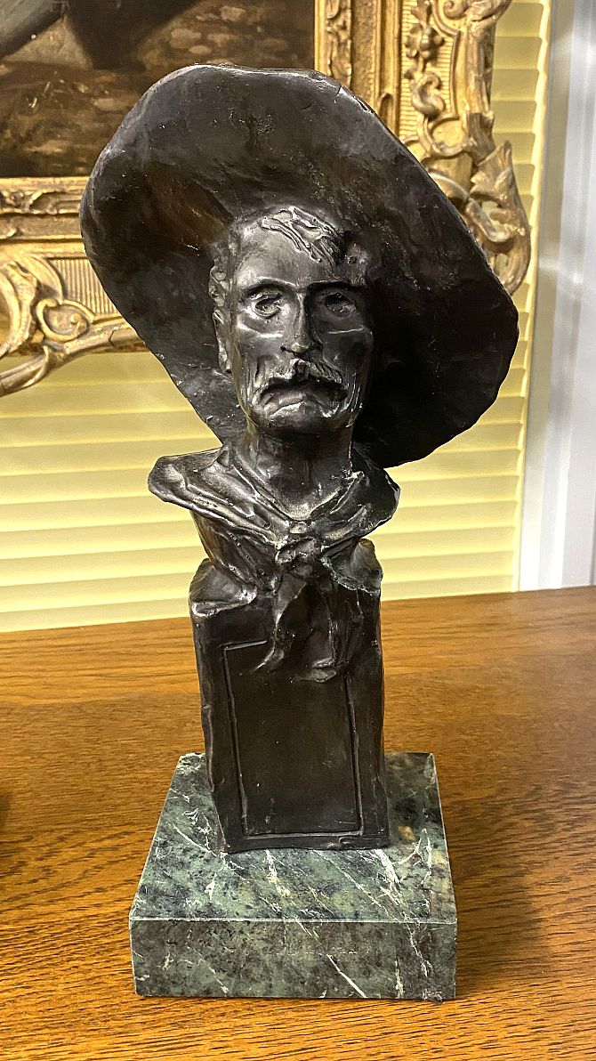 After Frederic Remington (American, 1861 - 1909) 'The Sergeant', a cast bronze bust of a 'Rough Rider' cowboy, signed to left side and back of plinth, on green marble base, height 28.75cm